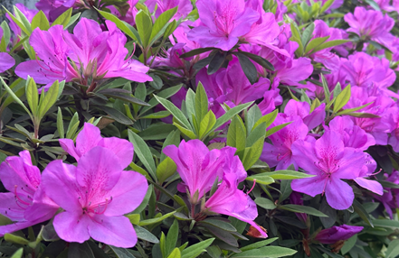 我住在上城,沿着小径一路回家,发现小区里亦有杜鹃花丛。靠近大门处,几株藏在草丛之间,只露出花冠,像羞怯的猫儿悄悄探首。行至小区中央,便是一大片了。有个品种稍显粉嫩,宛然紫杜鹃的后辈,怯生生地开在边上。遗憾的是,这附近曾生长着几棵劲瘦的树木,今日再看,只剩了光秃秃的树桩,周遭的地砖上洒满米白的粉屑,大约是树留下的痕迹罢。记得去年过节,这些树还穿起“衣服”,挂满小灯,一派暖洋洋的节庆氛围。砍了实在可惜,改日定要去问问缘由。