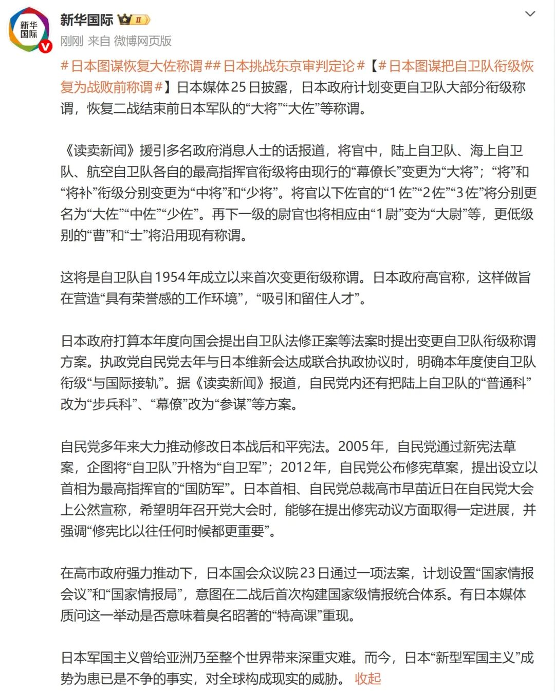 原标题:《日本政府图谋变更自卫队大部分衔级称谓,恢复二战结束前日本军队的“大将”“大佐”等》