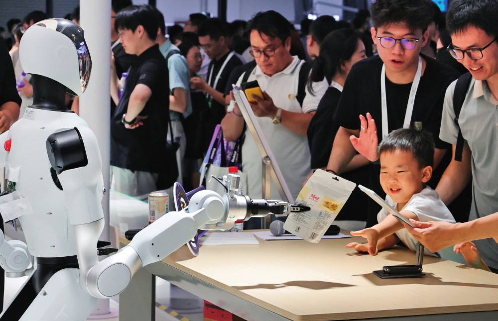 在上海举行的 2025 世界人工智能大会展览现场,小朋友从一个服务机器人“手”中接过自己选购的商品(2025年7月26日摄) 方喆摄 / 本刊