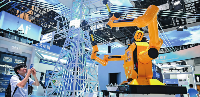 参观者在 2025 世界人工智能大会展览现场中国南方电网展区拍摄“悟空”带电作业机器人(2025年7月28日摄) 陈浩明摄 / 本刊