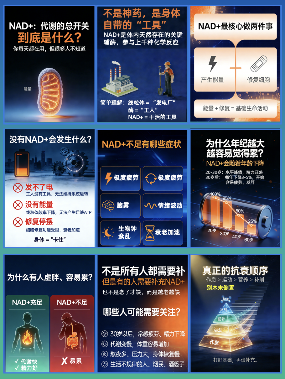 其实NAD+本身,只是一种细胞能量与修复的支持剂,不是什么“长生神药”;它的价值是帮助健康老龄化,而不是“逆天改龄”。