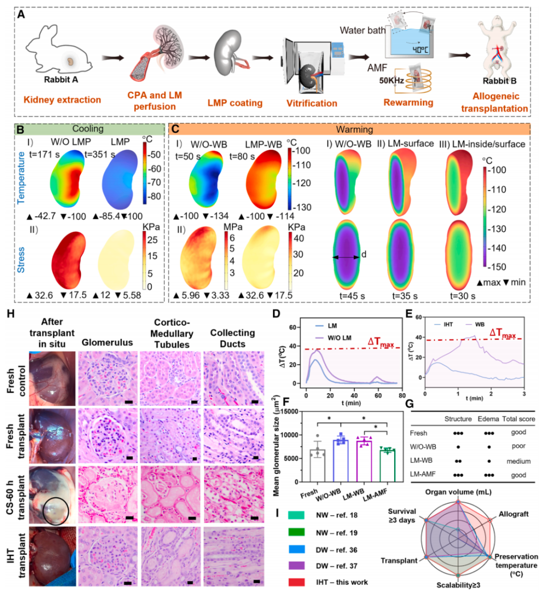 团队在兔皮肤、动脉、肾脏等多尺度生物样本中完成系统验证:-196℃玻璃化保存后,皮肤和血管复温存活率分别提升1.7倍和3.6倍;实现10mL级兔肾脏经-150℃玻璃化保存7天后,成功完成同种异体移植。相较于此前全球仅能实现的1mL级大鼠肾脏玻璃化保存后异体移植,实现了10倍尺度跨越。