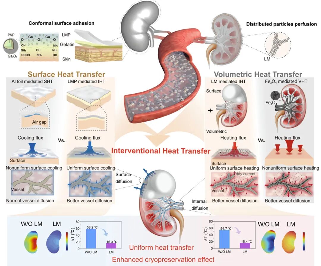 图1. 基于液态金属低温保护剂及多尺度介入强化传热的器官低温保存方法。