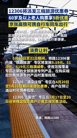 5月10日至31日期间,铁路12306客户端“铁路旅游”专区将发放5.19元、51.9元、519元三档满减券,使用范围覆盖专区上架的全部旅游专列产品,在购买相应价格旅游专列产品时直接抵现。