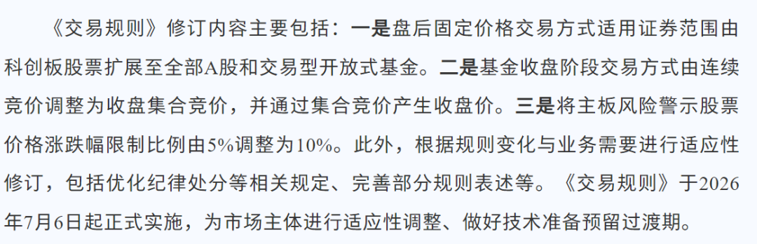 4月24日,上海证券交易所正式发布修订后的《上海证券交易所交易规则(2026年修订)》,新规将于7月6日实施,重点围绕盘后交易扩围、风险警示股涨跌幅调整和基金定价机制优化三大方向,旨在提升市场效率和流动性。