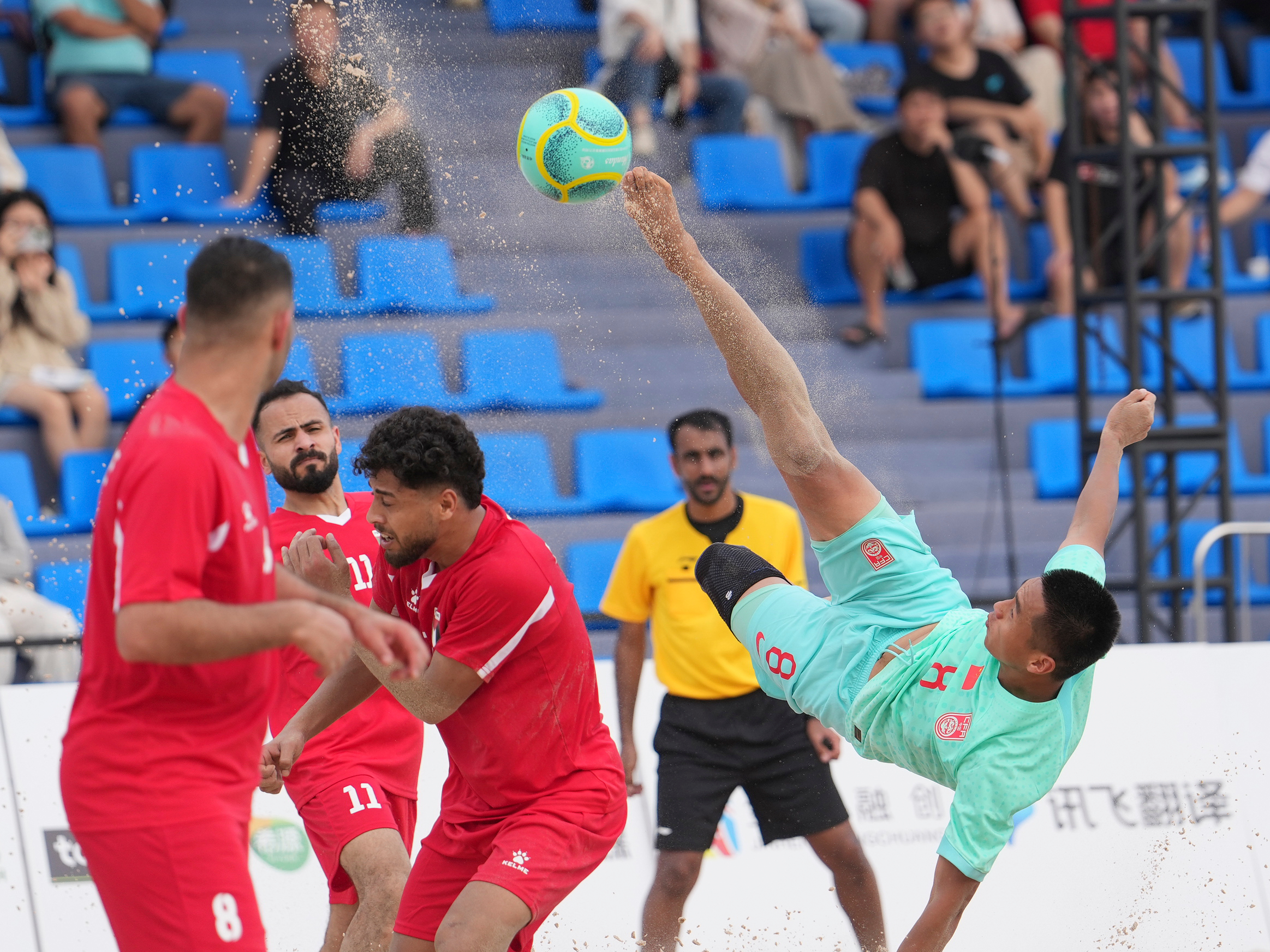 4月25日,在海南三亚举行的第六届亚洲沙滩运动会沙滩足球男子小组赛中,中国队3比4不敌巴勒斯坦队。中国队球员刘浩然(右)在比赛中倒钩射门。 本文图片均由第六届亚洲沙滩运动会组委会提供