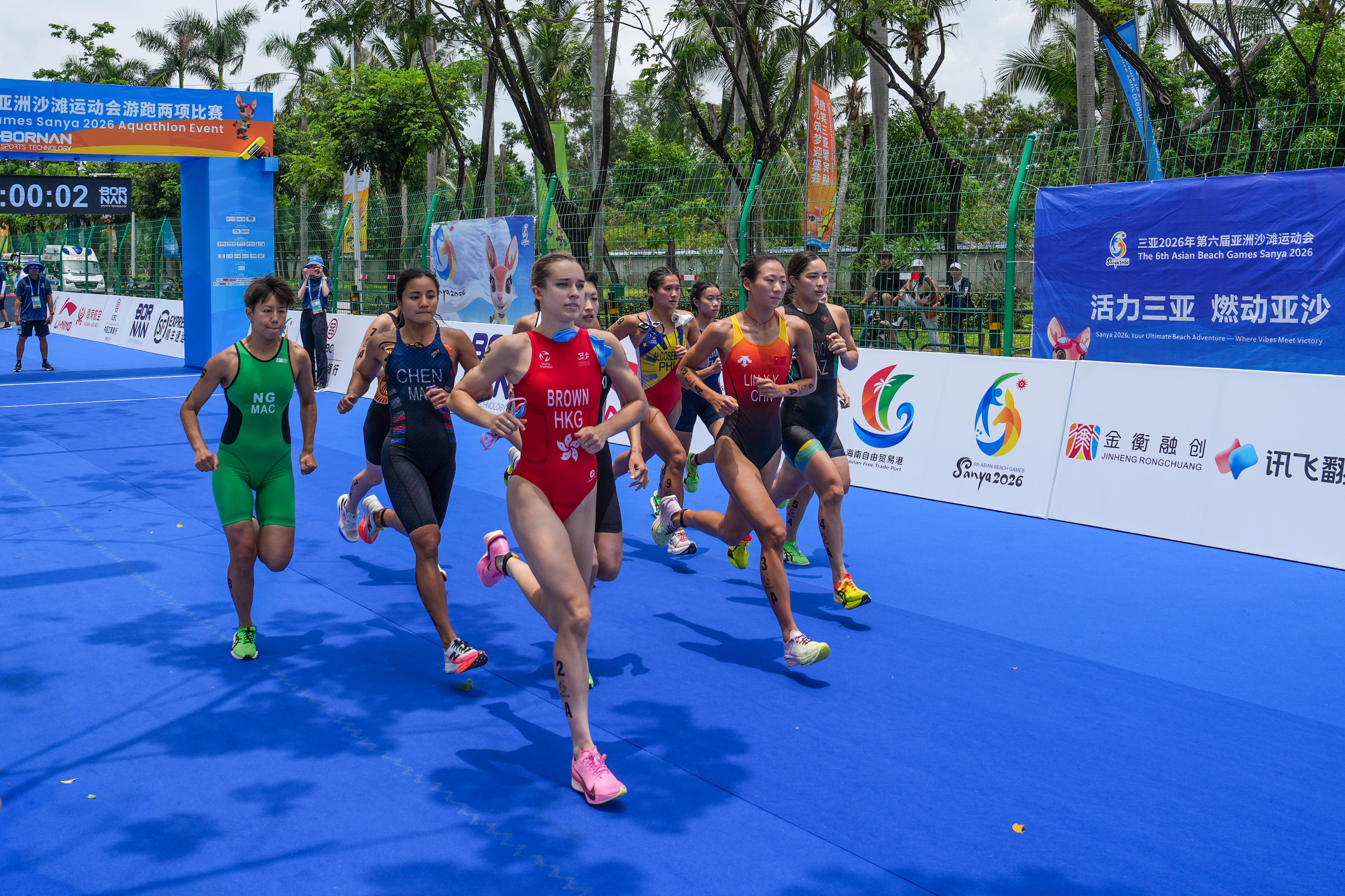 4月25日,在海南三亚举行的第六届亚洲沙滩运动会游跑两项4x混合接力赛中,选手们在比赛中出发。