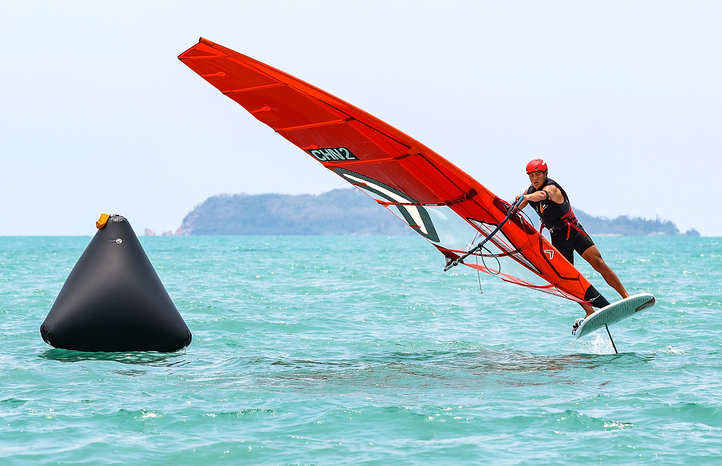 4月25日,第六届亚洲沙滩运动会帆船项目水翼帆板男子公开系列赛在海南三亚举行。中国选手卢奚彬在比赛中绕过浮标。