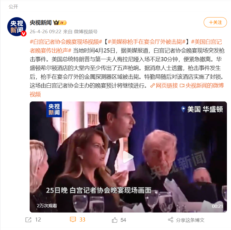 当地时间4月25日,据美媒报道,白宫记者协会晚宴现场突发枪击事件。美国总统特朗普与第一夫人梅拉尼娅入场不足30分钟,便紧急撤离。