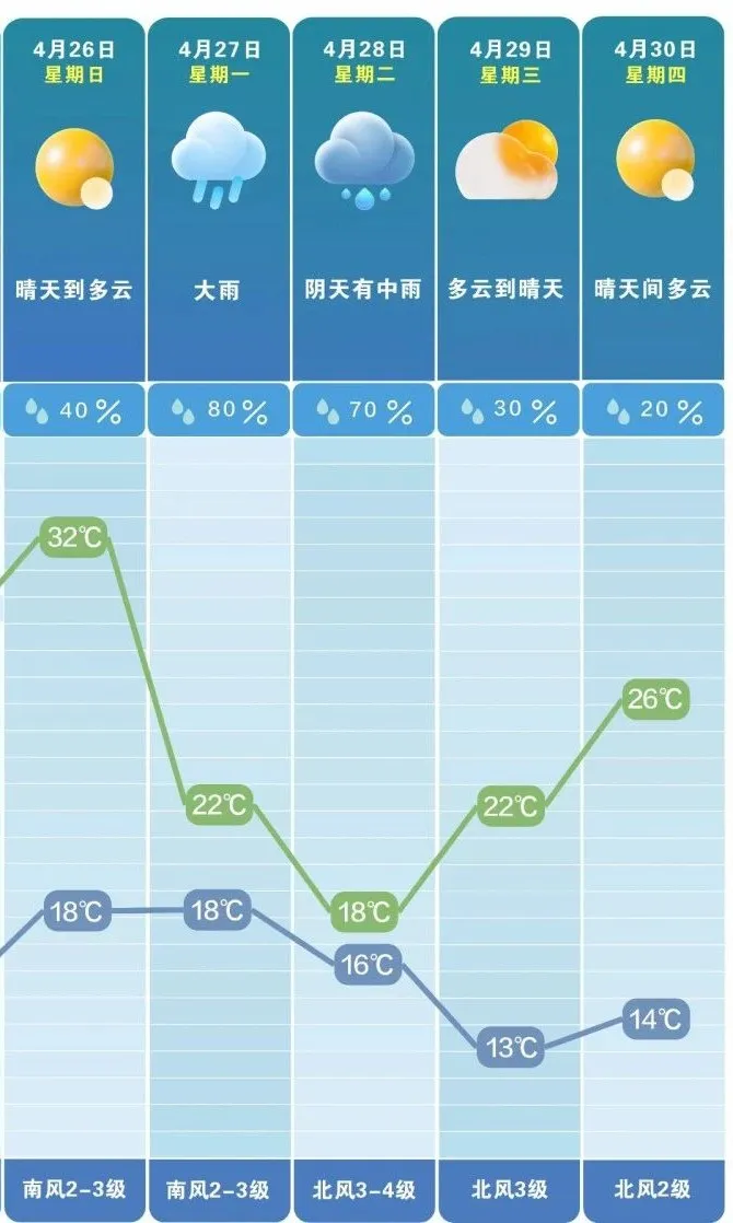 据市气象台预计,4月27日(下周一)全市有大雨,气温下降到18℃至22℃,降水概率高达80%;4月28日阴天有中雨,气温进一步下滑,16℃至18℃,北风3到4级,体感会明显冷不少;4月29日雨停,多云到晴天,但最低气温将跌至13℃,最高气温也只有22℃;4月30日,气温会有所上升,14℃至26℃。