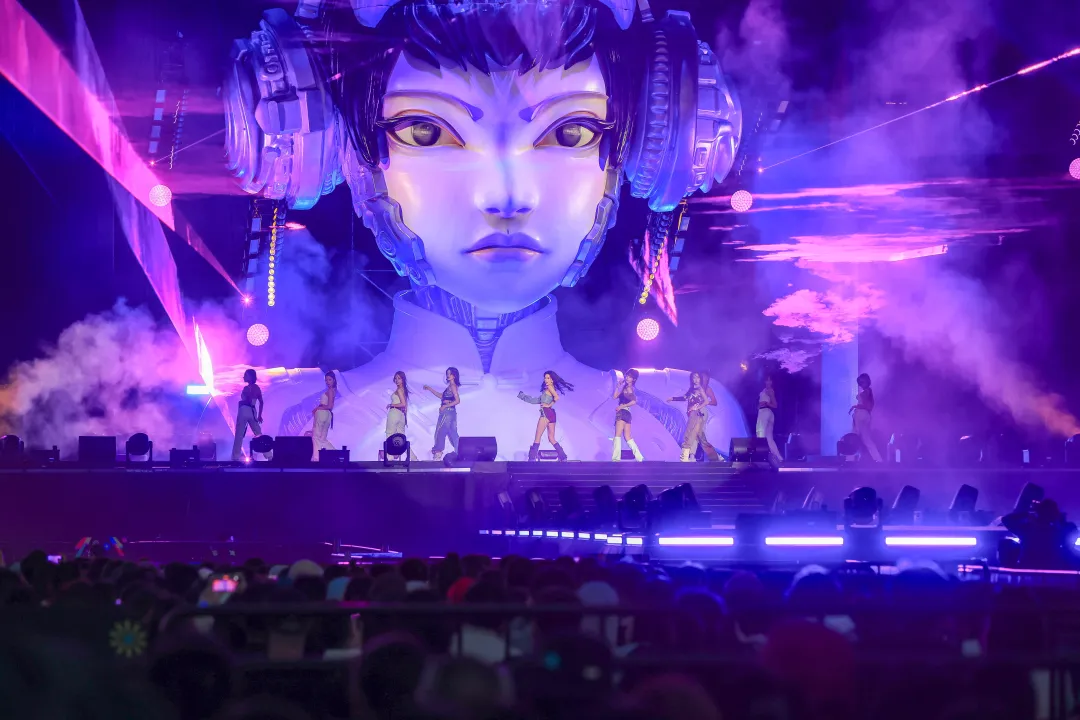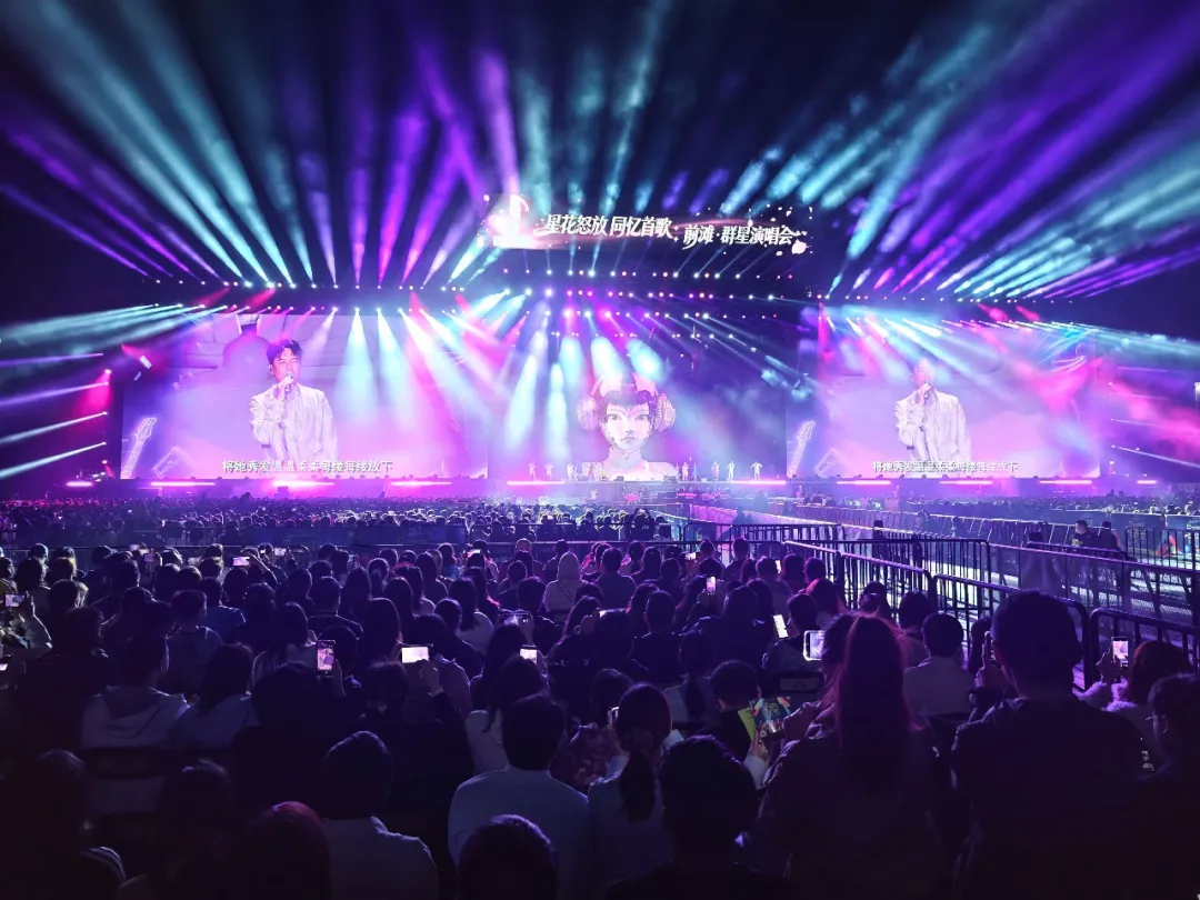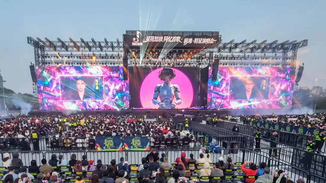 该形象由“同忆首歌”节目组联合顶尖AI实验室共同孵化,“她”在舞台中央打碟、唱歌、跳舞、主持,引导全场观众举起手中的荧光棒或手机,实现光影同频共振。2800平方米的LED大屏幕确保每个角度都能清晰感受舞台魅力。这场演出也是“前滩音乐节”第一场全坐席户外演唱会,观众舒享3小时的音乐盛宴。