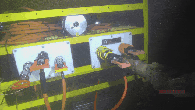 深海湿插拔连接器,是海铃一期潜标与海底接驳盒实现组网连接的关键设备。为全面验证湿插拔连接器在真实深海环境下的性能,项目组自主研制适插拔测试平台,依托“海马号” ROV,针对5套国内不同厂家的深水湿插拔产品完成了3500米水下多次水下动态插拔操作,系统测试了电气导通、海水绝缘及光通信功能。