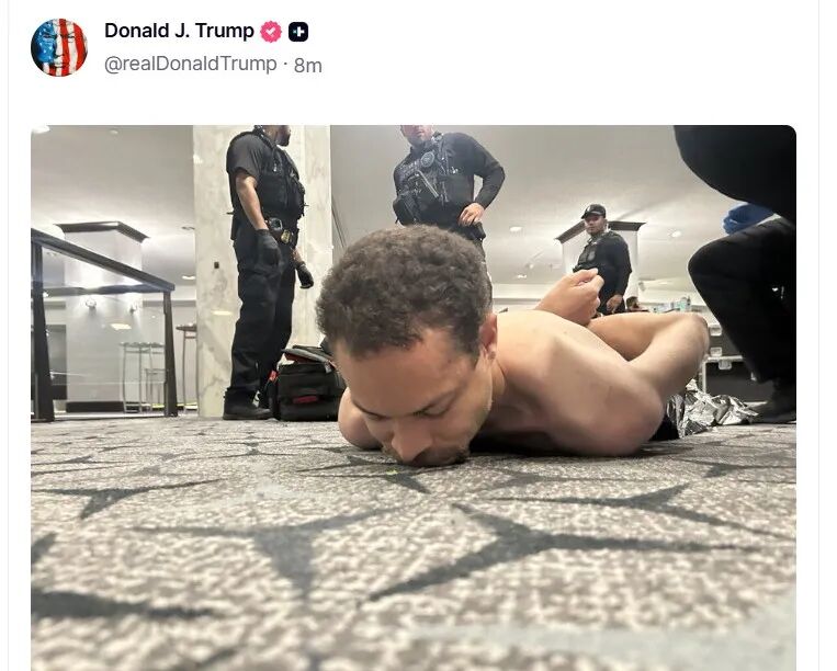 据CCTV国际时讯报道,美国总统特朗普在“真实社交”上发布了一张照片,照片显示一名男子躺在华盛顿希尔顿酒店的地上。该男子似乎是嫌疑人。