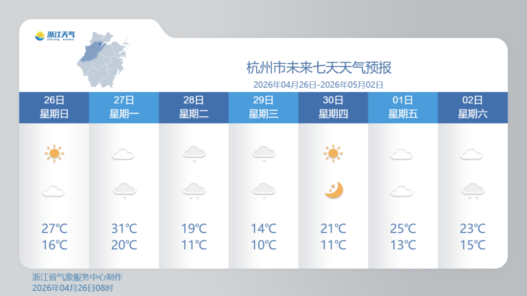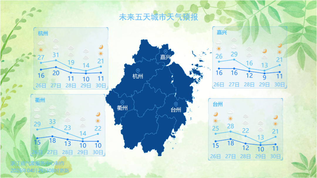 同时,气温被雨水“大收割”,湿冷感明显,最高气温迫降10℃以上,比如杭州,27日最高31℃,28日仅剩19℃,如此换季式降温督促您及时增添衣物,谨防感冒!