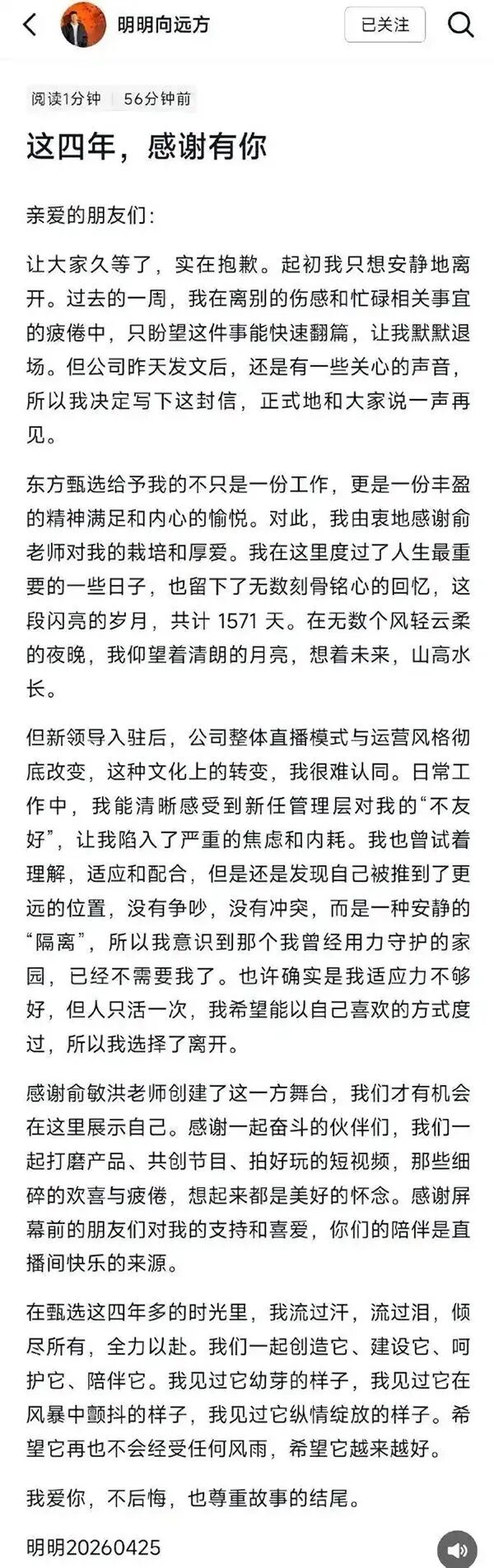 明明表示:“由衷地感谢俞老师对我的栽培和厚爱。我在这里度过了人生最重要的一些日子,也留下了无数刻骨铭心的回忆,这段闪亮的岁月,共计 1571 天。在无数个风轻云柔的夜晚,我仰望着清朗的月亮,想着未来,山高水长。但新领导入驻后,公司整体直播模式与运营风格彻底改变,这种文化上的转变,我很难认同。日常工作中,我能清晰感受到新任管理层对我的“不友好”,让我陷入了严重的焦虑和内耗。我也曾试着理解,适应和配合,但是还是发现自己被推到了更远的位置,没有争吵,没有冲突,而是一种安静的“隔离”,所以我意识到那个我曾经用力守护的家园,已经不需要我了。也许确实是我适应力不够好,但人只活一次,我希望能以自己喜欢的方式度过,所以我选择了离开。”