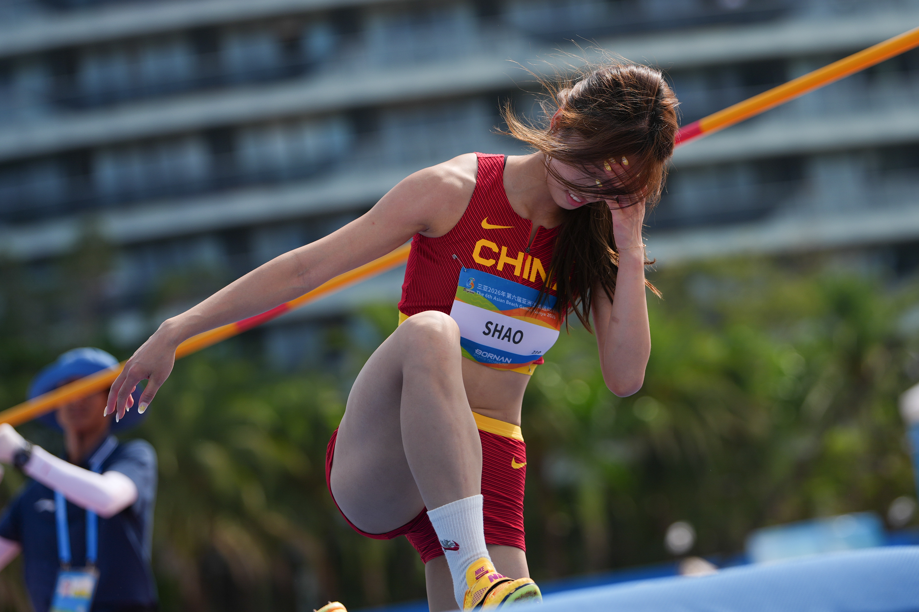 4月26日,在海南三亚举行的第六届亚洲沙滩运动会沙滩田径女子跳高决赛中,乌兹别克斯坦选手巴尔诺洪·赛富拉耶娃获得冠军,中国选手胡麟鹏和邵雨琪获得并列亚军。 中国选手邵雨琪在比赛中。 第六届亚洲沙滩运动会组委会供图