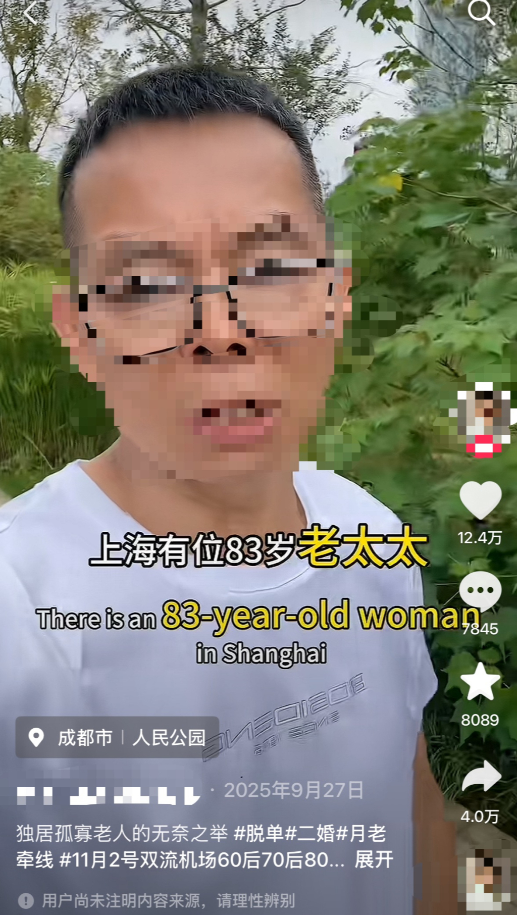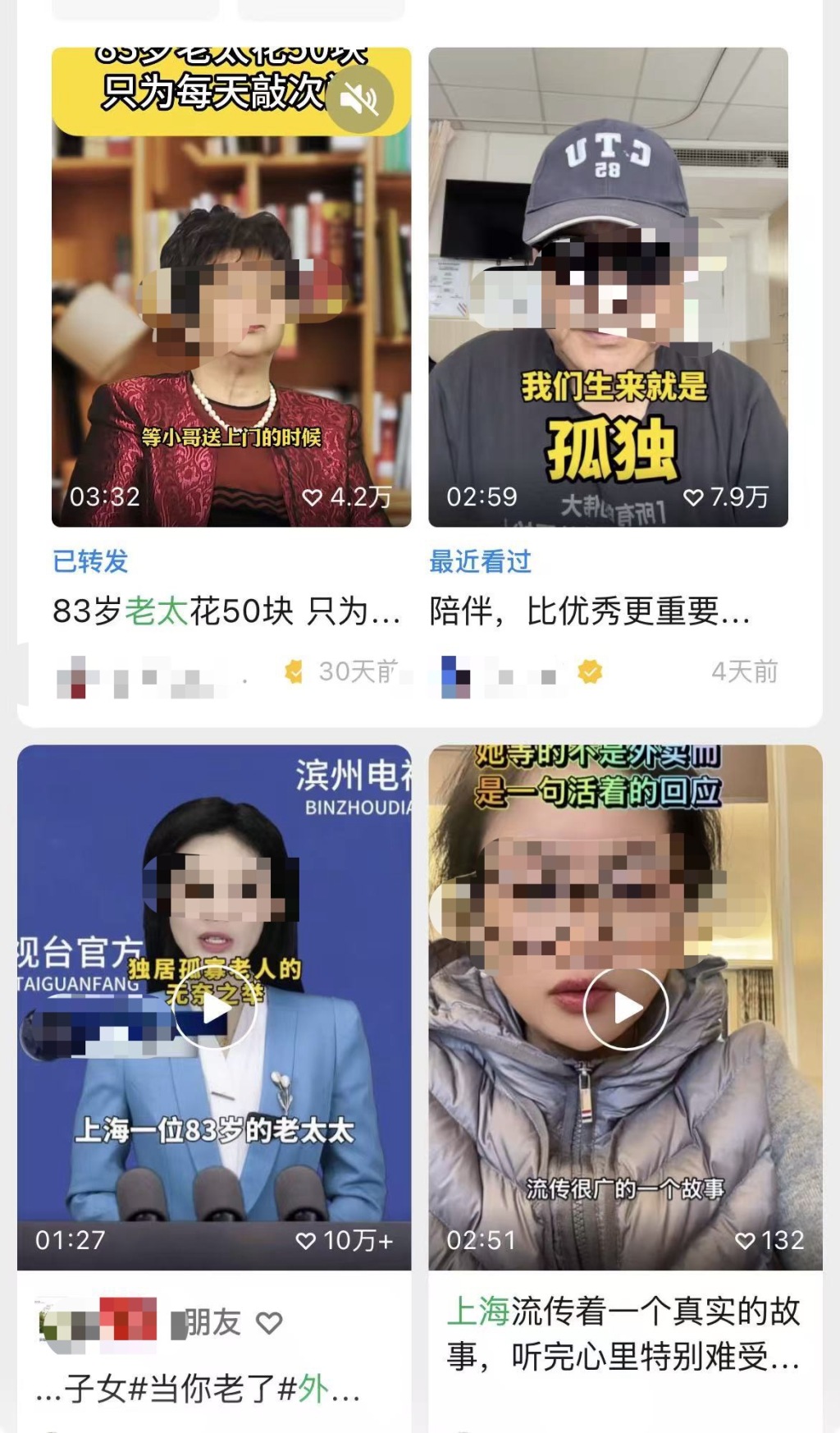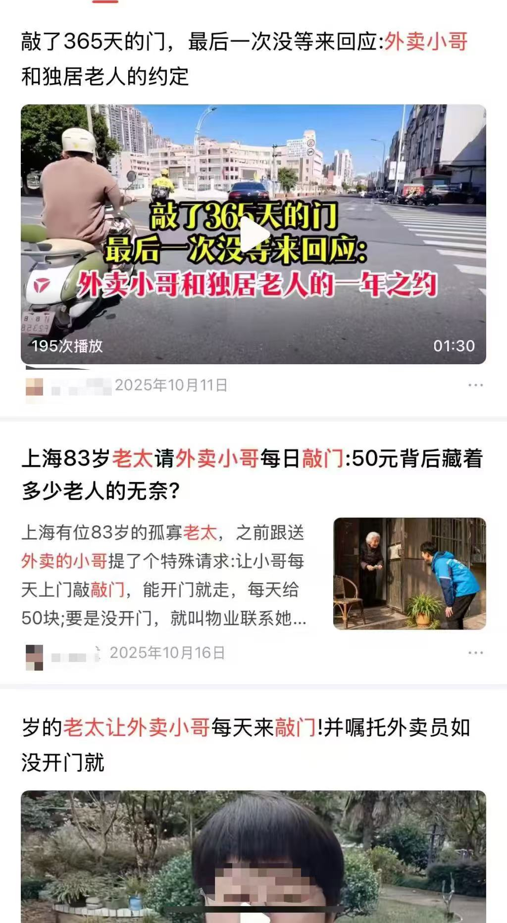 2025年10月以来,多个账号在平台上发布有关“上海83岁老人日付50元请外卖小哥敲门”的故事。