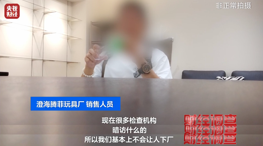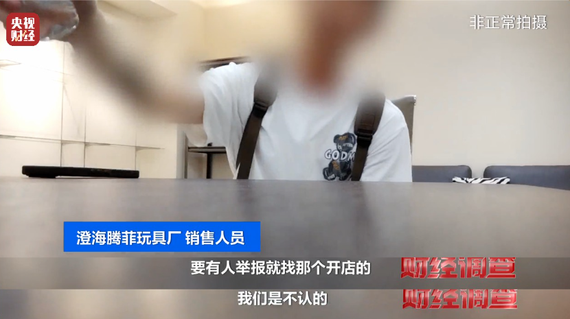 记者以进货为由,几经辗转见到了这些“三无产品”的生产商腾菲玩具厂的销售人员。工作人员告诉记者,市场上这些“三无产品”都是从自家工厂流出的,一旦被监管部门注意到,就会用“只做外销”为借口逃脱监管处罚。
