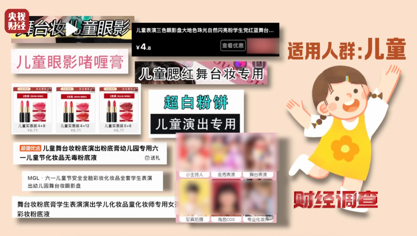 记者按照消费者提供的线索,在电商平台搜索“儿童化妆品”“儿童表演化妆”等关键词,“儿童舞台妆专用粉底”“儿童舞台专用眼影”“小女孩专用正红口红”“儿童腮红口红”,各类标榜“儿童专用”的化妆产品种类很多,宣传图、详情页以及售后评价中,也都明确显示,这类产品的适用人群就是针对儿童。