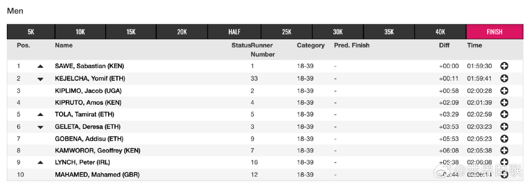 获得亚军的科杰尔查同样打开两小时,1小时59分41秒创造人类首马历史最好成绩;雅各布·基普里莫获得季军,2小时00分28秒同样超越了基普图姆保持的原世界纪录!
