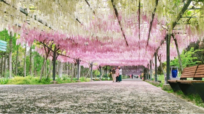 长廊种植了不少知名紫藤品种,以浪漫紫色为主调,清新粉白作点缀,花穗修长且形态多变,每一串花穗都独具美感。