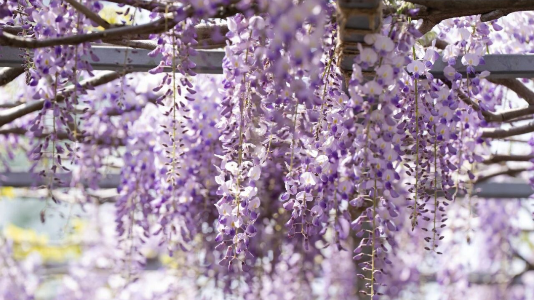 紫色的熊野紫藤花穗饱满,色泽温润,微风一吹,花穗轻摇,是拍照出片的绝佳背景。