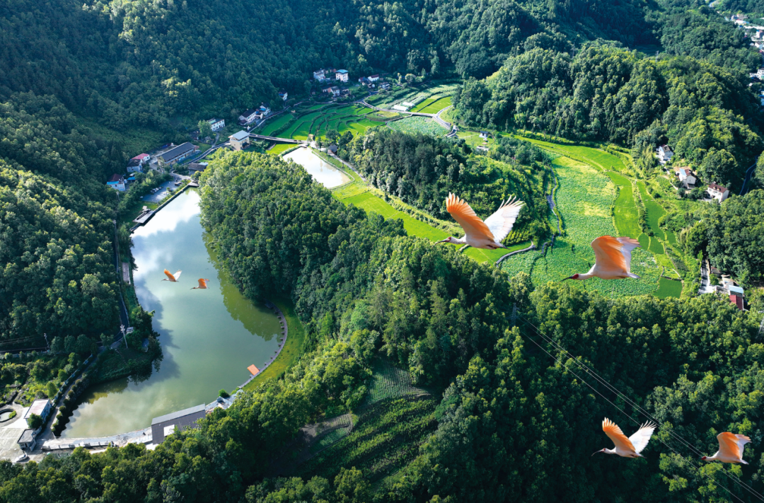 青山如黛,朱鹮翩翩飞过