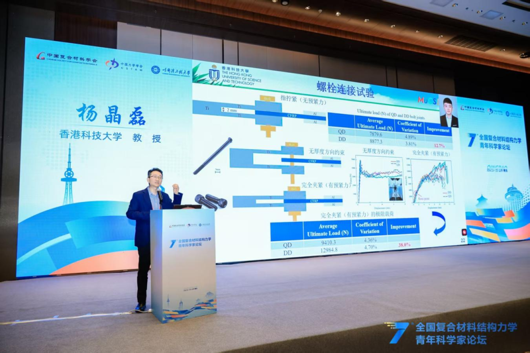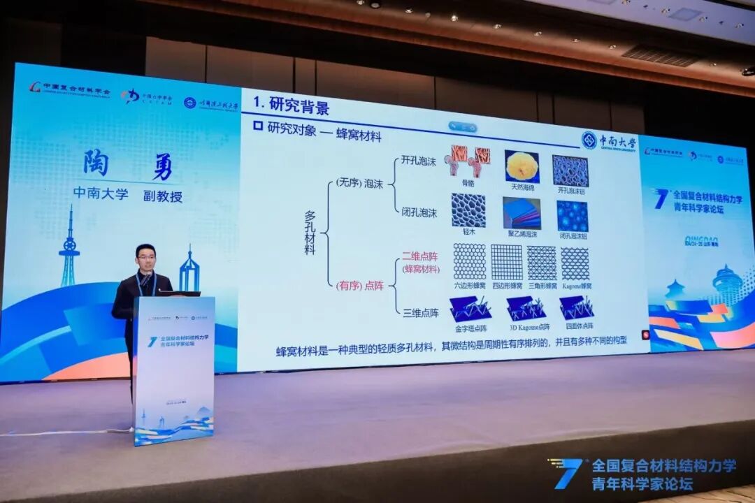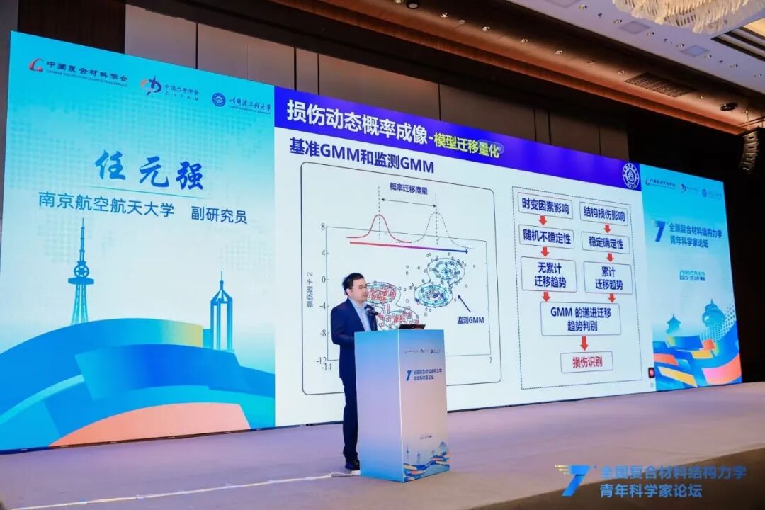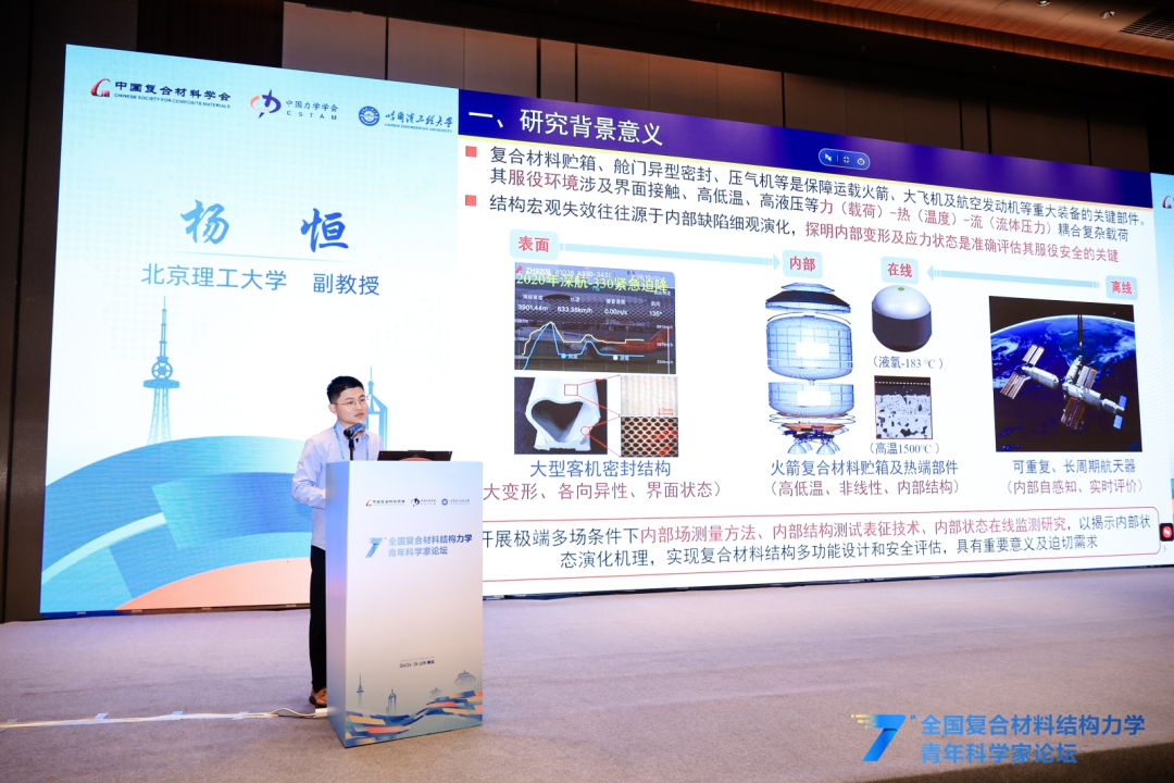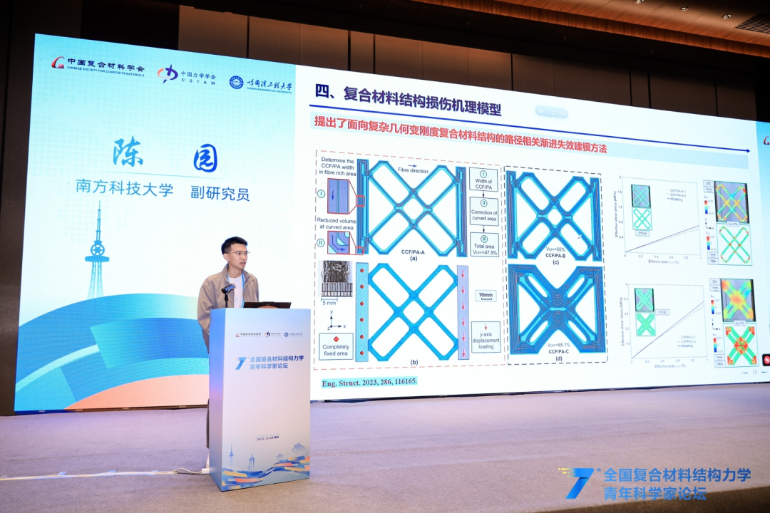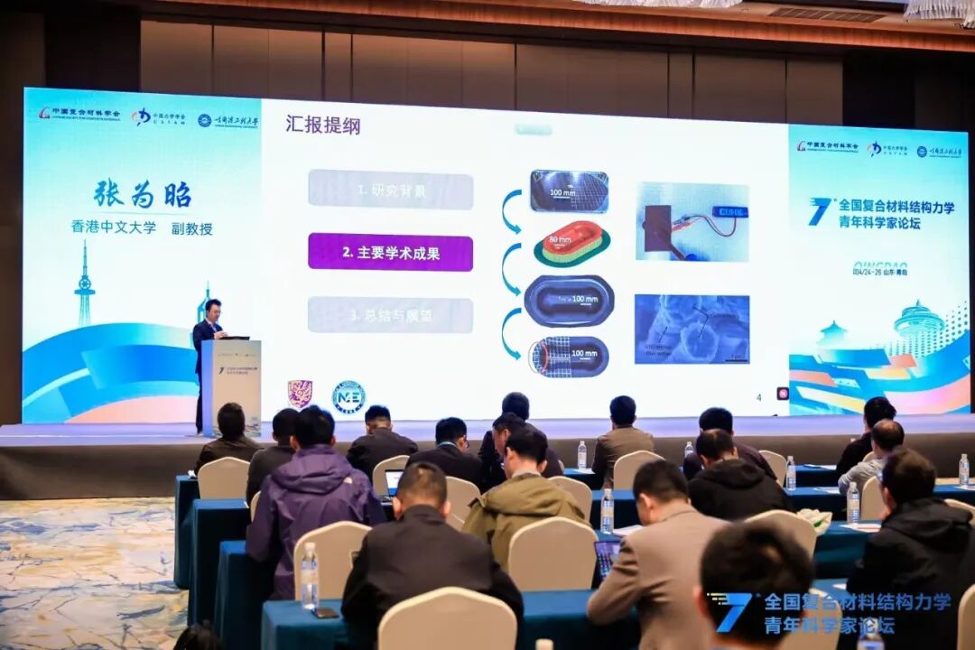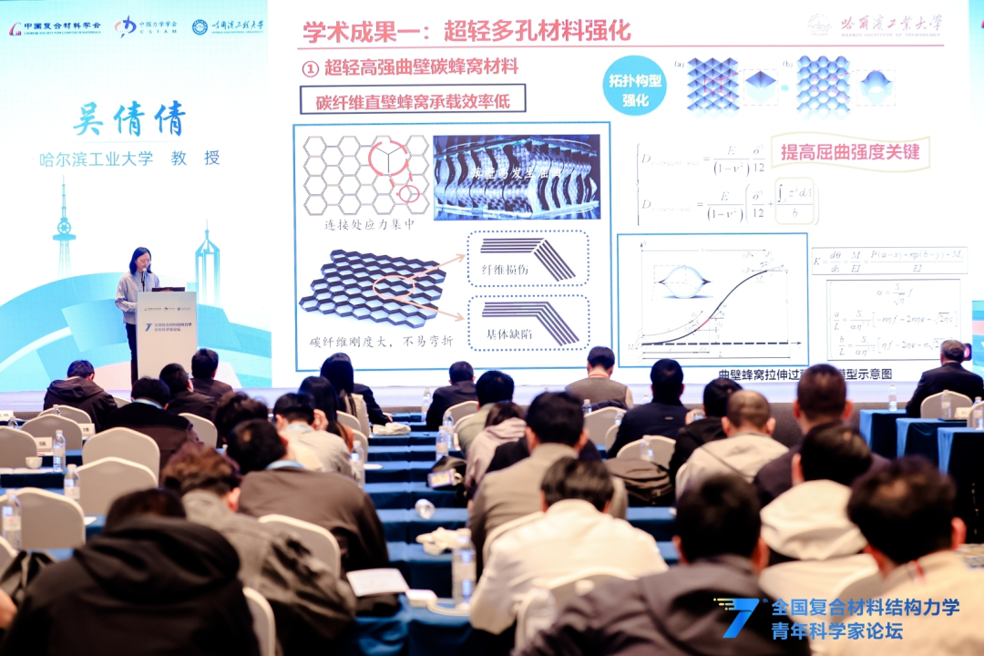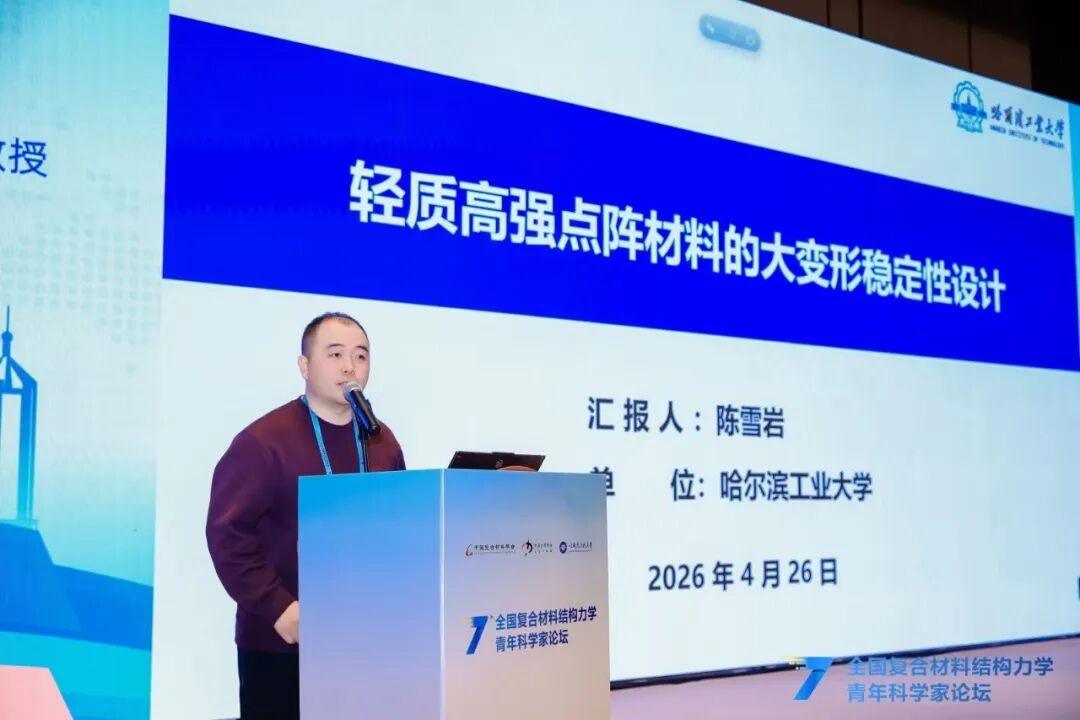 在精彩纷呈的青年学者交流报告环节,北京航空航天大学潘飞副教授、哈尔滨工业大学吴倩倩教授等18位青年学者结合各自最新研究成果与前沿探索方向,围绕超材料结构智能探索、超轻多功能复合材料设计、变刚度连续纤维复材结构、极端多场耦合测试表征、空天结构数字孪生、复合材料损伤成像与疲劳可靠性等核心议题,分享了研究中的关键突破、创新思路与实践经验,充分展现了我国复合材料力学领域青年科研工作者的新锐思想与蓬勃朝气。