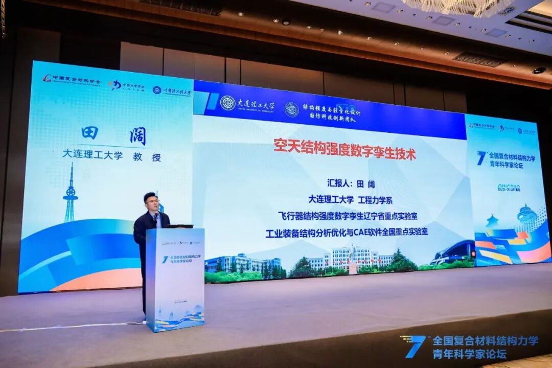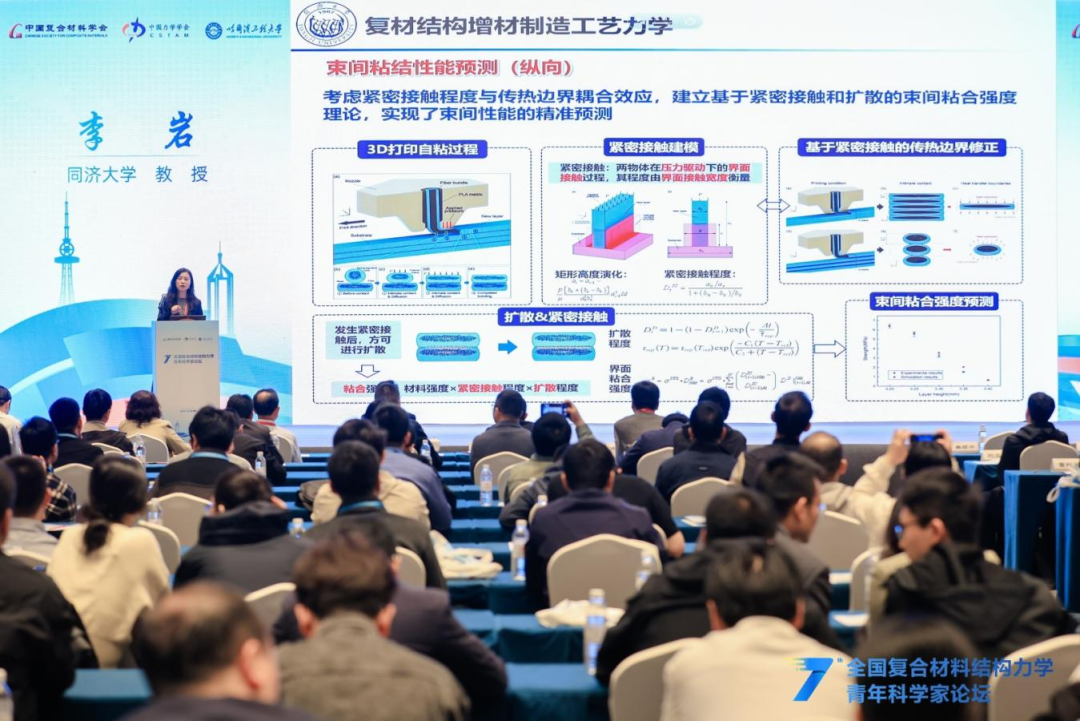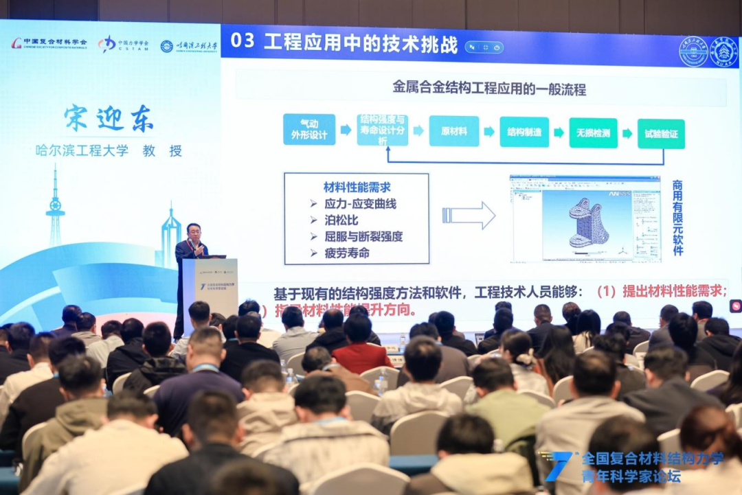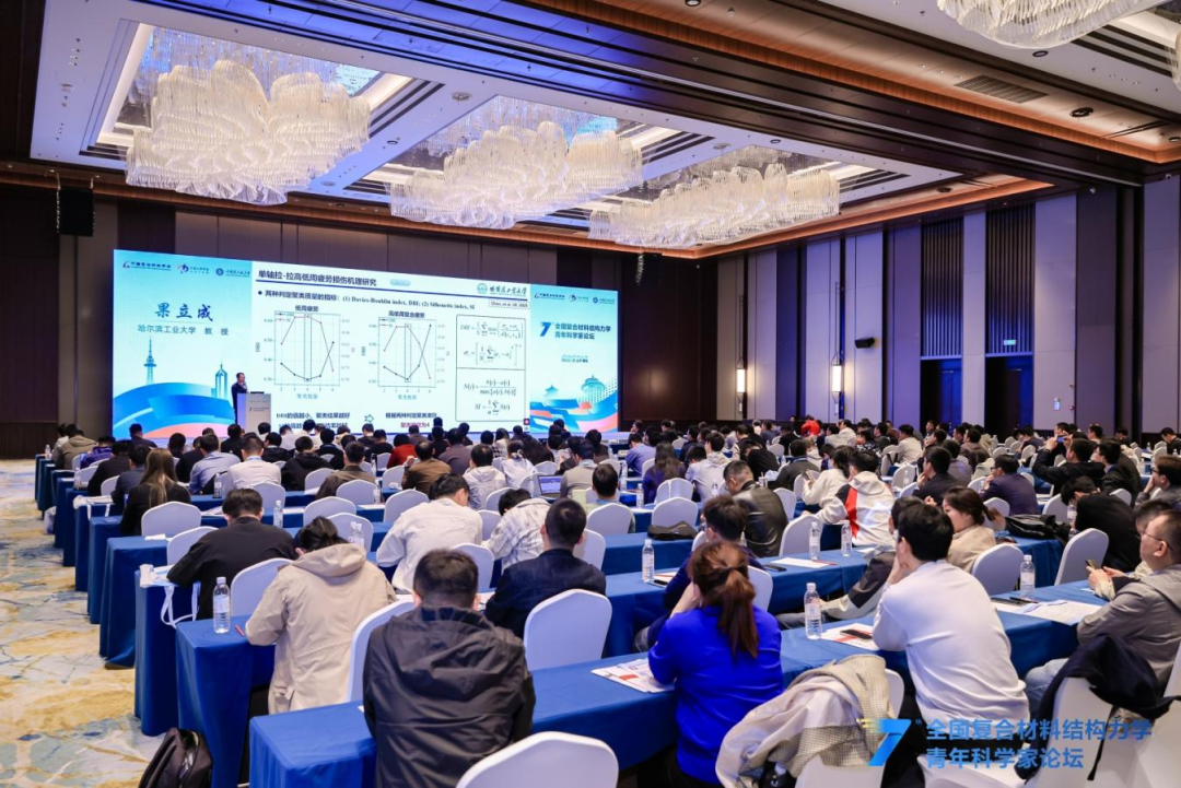 大会报告环节,哈尔滨工程大学/南京航空航天大学宋迎东教授分享了航空发动机陶瓷基复合材料在极端服役环境下的结构强度分析方法与设计准则,重点介绍了团队目前在陶瓷基复合材料多尺度损伤演化建模、寿命预测及可靠性评估方面的关键突破;同济大学李岩教授聚焦先进复合材料结构制造工艺力学,分享了团队在大型客机复合材料夹芯结构制造全过程工艺力学仿真分析、连续纤维复合材料增材制造多尺度工艺力学模型构建、基于增材制造的大型复合材料结构件制造-检测一体化平台方面的最新研究进展;香港科技大学杨晶磊教授介绍了使用Double-Double层合板理论指导设计复合材料结构,及其在面内、低速冲击、开孔疲劳等方面的性能优势,以及固化变形控制、变厚度层板制造方面的优势,指出DD是复材设计范式转变,并提出工艺适配、全尺寸验证等未来挑战;哈尔滨工业大学果立成教授聚焦纤维增强复合材料高低周复合疲劳问题,分享了构建基于物理信息神经网络的数据-物理融合疲劳-蠕变模型、考虑载荷交互作用的高低周复合疲劳渐进损伤模型的过程,提出多源试验与AI融合是解决复合材料疲劳工程问题的关键方向。