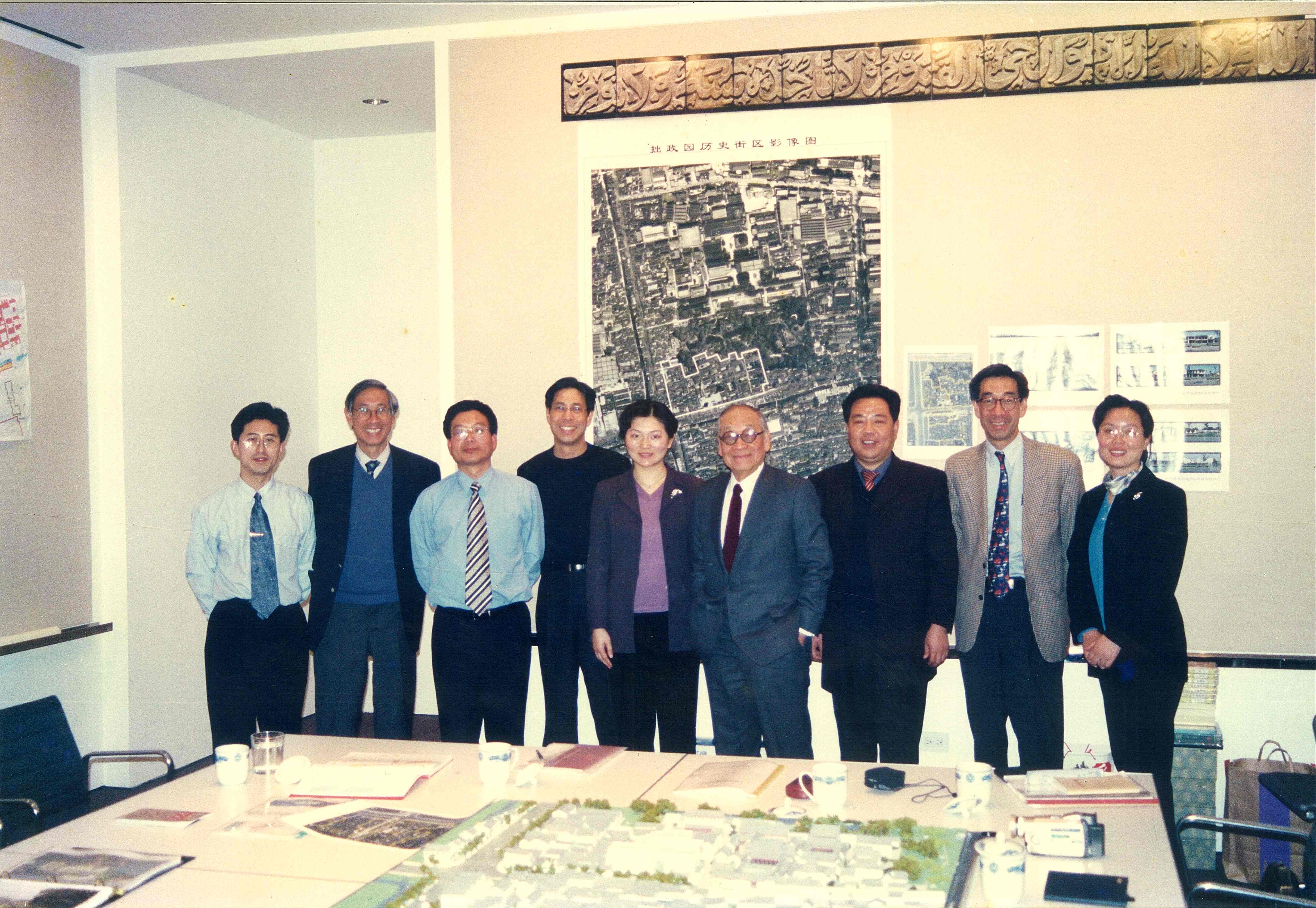 仅两个月,贝老那边就伸出了橄榄枝,2001年6月苏州市政府分管规划、城建的副市长和文化、规划部门负责人,应贝聿铭先生的邀请,赴北京参加长安街西侧中国银行总行大厦竣工落成典礼,我们受市政府委托,正式邀请贝聿铭先生和贝氏事务所设计苏州博物馆新馆。领导们无不关心、支持贝聿铭设计这件大事,不久,市政府分管文化的副市长访美,又顺路专程去纽约贝老处补送了一份邀请书,也是我们认真联系安排的。2002年2月20日,记得春节刚过,我与规划局局长谭颖受市政府委托,首次组团赴美,这次邀请进入实质性探讨设计。以当时在纽约贝氏事务所一桢合影为证,还有文广局分管文博的副局长、文物处长和一位兼任英文翻译的同事,与贝老及三个儿子一起,共九人,笑得很灿烂,背景墙面张挂、工作桌上摆放大幅选址航测图和规划图。贝老胸有成竹,一切准备就绪,就等着我们呢,真是心想事成,势如破竹。