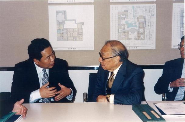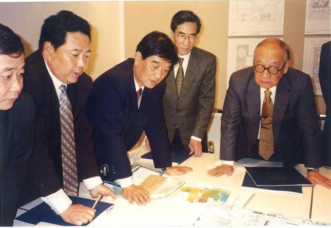 我放下电话立即安排,几位同事第一时间跟我上机场飞抵成都。原来成都发现并考古发掘金沙遗址,金沙遗址是继三星堆遗址之后又一重大考古发现,又根据天府广场实际,正考虑调整为建金沙遗址博物馆。成都市文化局局长是一位女局长,大我几岁,非常热情,她带川剧院来苏州时,听我说过,苏州想邀请贝聿铭设计苏州博物馆。她陪我参观天府广场、金沙遗址,一路上指点我要做通贝老的工作,首先要做通贝夫人的工作,而贝老的侄女贝念岳与贝夫人最亲,并将联系方式给了我们。天赐良机,回到苏州按照她的指点,我们与苏州市规划局密切配合,果然奏效。前期工作与贝氏事务所的联系,以市规划局为主,2000年11月贝聿铭的小儿子贝礼中先生曾来苏州踏勘苏博太平天国忠王府和拙政园,我曾配合市规划局接待。