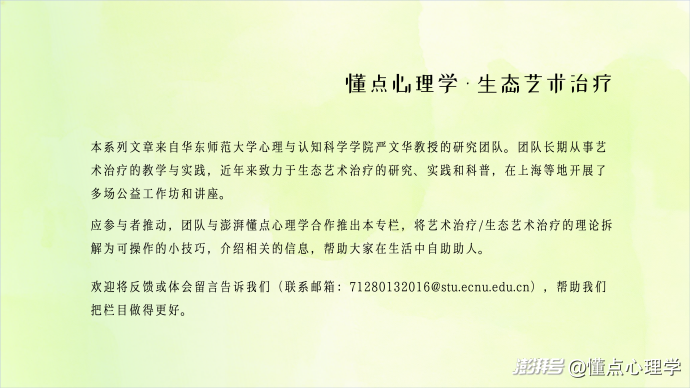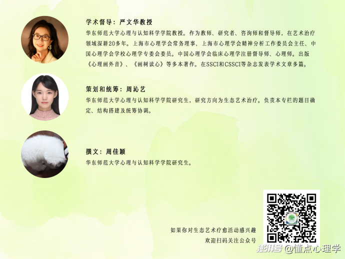 在一项名为“THRIVE”的园艺治疗项目中,通过持续接触自然,传授基于自然互动的技能,将体验式学习、理论教学和团队建设相结合,研究结果表明,参与者的心理韧性得到增强,压力水平、抑郁情绪和孤独感均有显著下降(Meore et al., 2021)。在这篇文章中,我们从表达性艺术治疗的视角,设计了一份为期四周的“园艺+艺术”亲子心理疗愈实践指南。这张“绿色处方”同样希望运用来自大自然的生命力和画笔下的创造力,重新缝合与疗愈亲子关系。