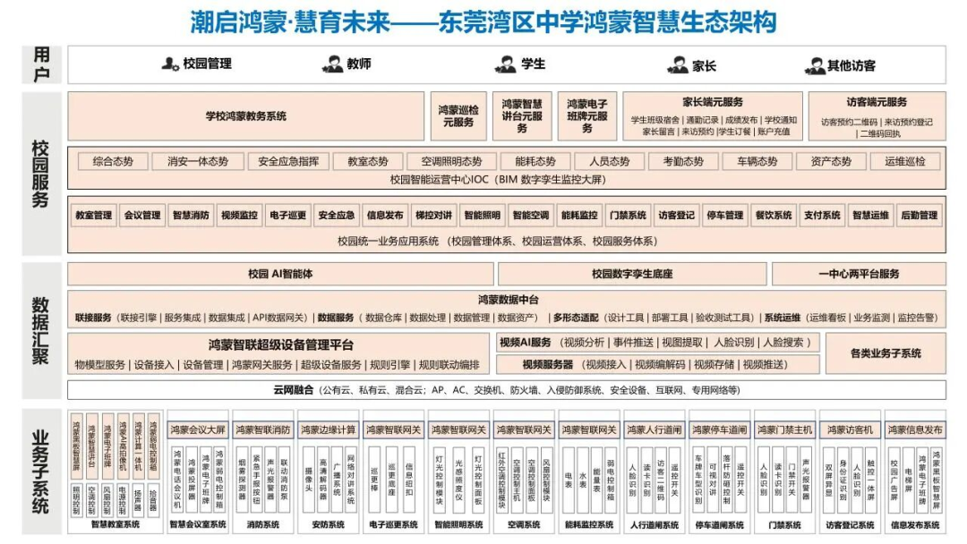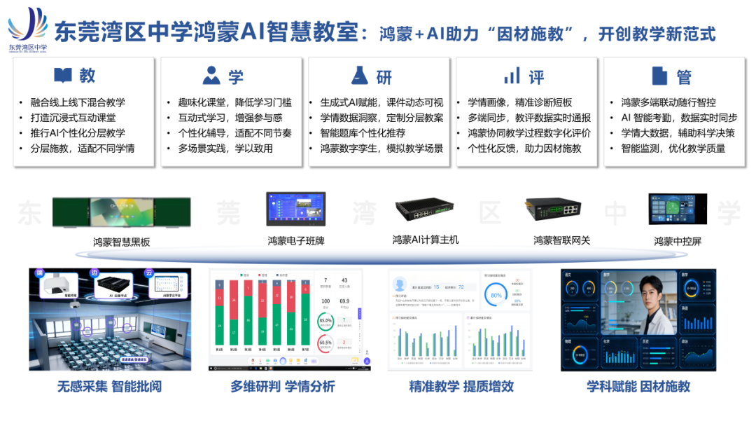 东莞湾区中学作为首批鸿蒙智慧校园试点,构建“1+9+N”智慧教育生态。以1个市级教育鸿蒙数字基座校级节点为核心,覆盖教、学、管、评等9大核心场景,联动N类鸿蒙终端,实现跨设备协同与数据互通,全方位破解校园治理痛点。