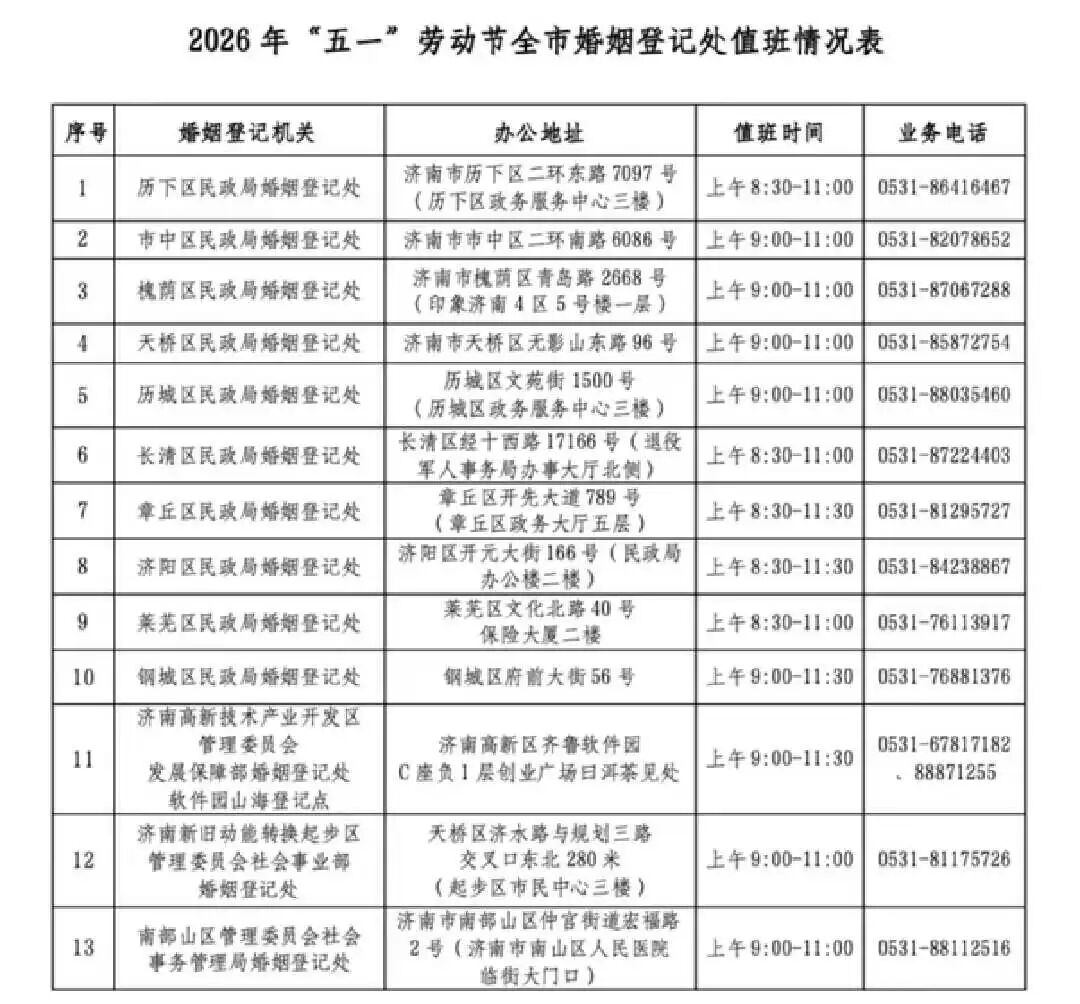 4月27日,记者从济南市民政局获悉,为进一步优化婚姻登记服务,满足群众多样化、个性化办事需求,不断提升便民服务质效,全市13家婚姻登记处2026年5月1日当天开展结婚预约登记服务。