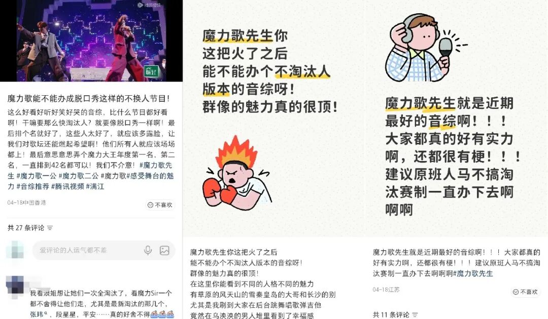 随着《魔力歌先生》公演的进行,这些体验都被囊括其中,甚至《魔力歌先生》给到观众的,是更多、叠加的追综体验。“《魔力歌先生》大事很妙”“我宣布魔力歌先生是近几年最好的音综”“《魔力歌先生》,夯”……在社交平台上,不少网友情绪满满、直白写下自己的喜爱。