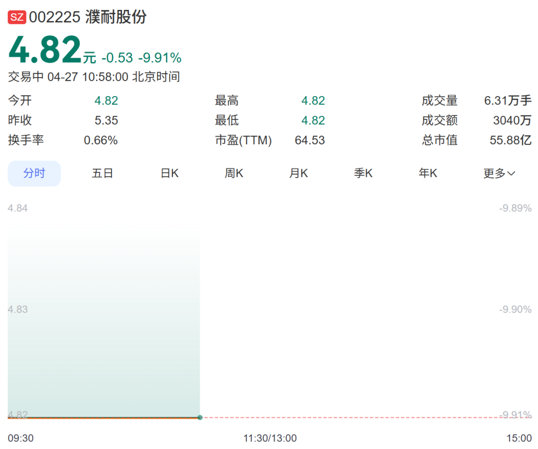 4月27日,濮耐股份开盘一字跌停,股价报4.82元,封单超11万手。