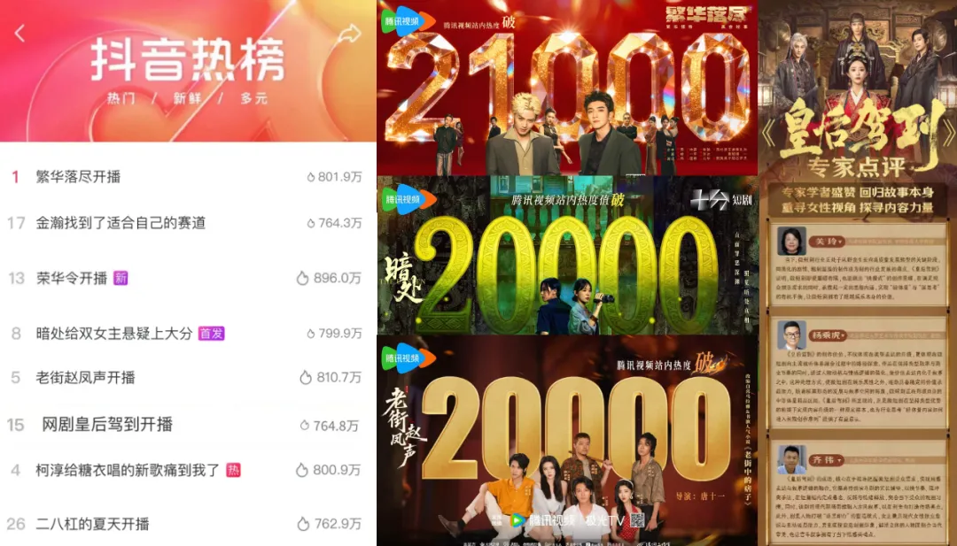 悬疑赛道表现尤为突出,《繁华落尽》《暗处》《老街赵凤声》三部作品站内热度均突破20000,形成赛道集群爆发。其中,《繁华落尽》开播首日登顶抖音娱乐榜,以视听质感引爆话题;《暗处》凭借东南亚美学与人性内核,催生多条10万赞爆款视频;《老街赵凤声》全网声量超12亿,市井烟火气引发大众共鸣。