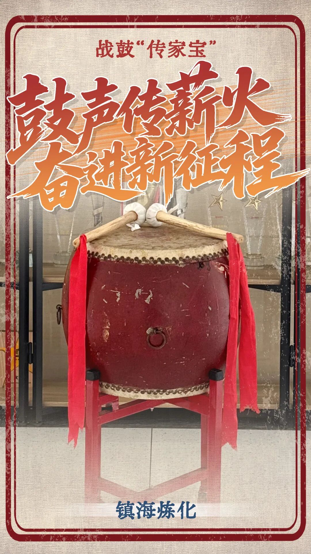 这是一面直径近一米的大鼓,暗红漆面斑驳褪色,鼓身还依稀刻着“化肥工会”四个遒劲大字,鼓槌上系着的两条红丝带,鲜艳如初。它自二十世纪八十年代大化肥工程破土动工起便擂响战鼓,曾为化工部转型升级凝聚众志成城的力量,如今又在氢能制造部“最强操作”竞赛上,为选手们呐喊鼓劲。半世纪的时光流转,它见证了一代代石化人在不同征程里攻坚克难的热血与担当。它静立一隅,鼓面的裂纹里藏着岁月的回响,却依旧能敲出振聋发聩的节拍。对我而言,它不只是一面老鼓,更是身为石化人,在新时代里赓续拼搏、传承使命的铿锵号角。