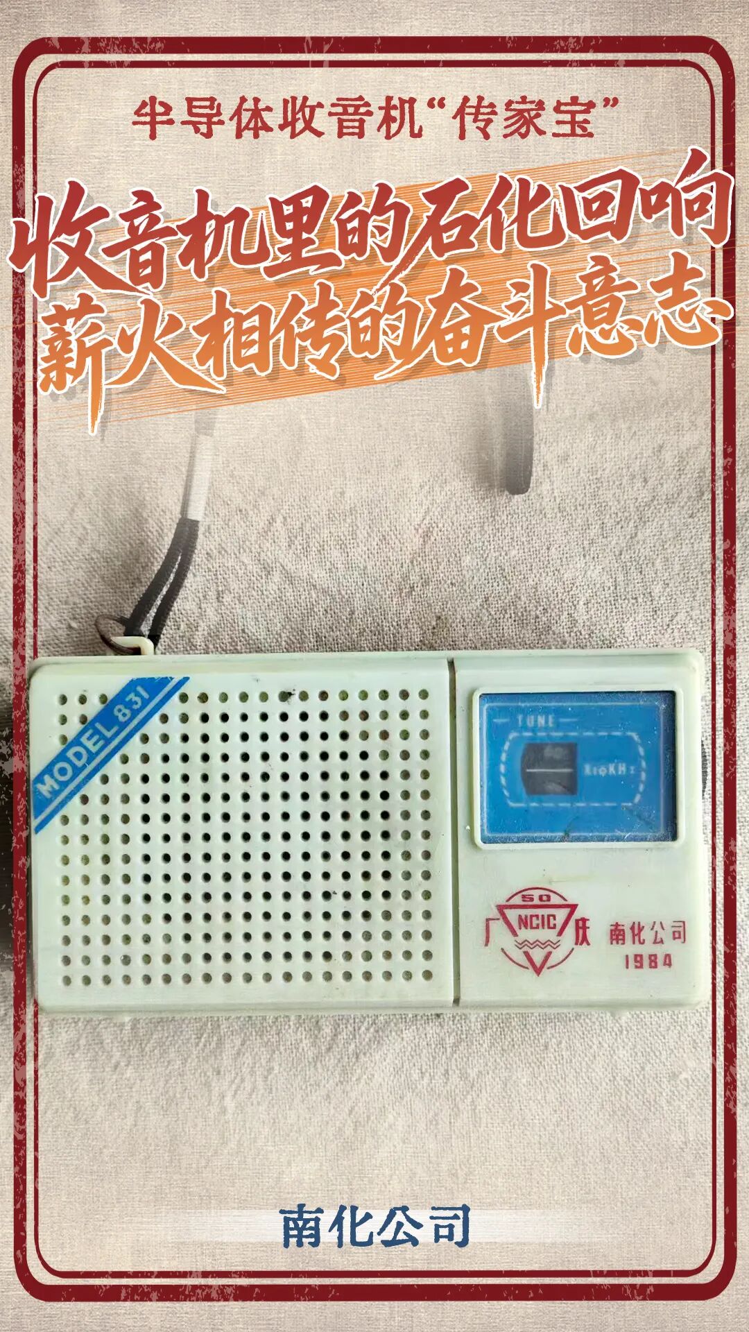 这是一台1984年南化公司厂庆50周年定制的便携式半导体收音机,机身印刻着“南化50载奋进向未来”的字样,是当年的“时髦好物”。它是公司发给时任南化氮肥厂一机修车间起重班班长——我的岳父董金友的荣誉纪念。二十世纪八十年代,岳父操控着当时罕见的100吨汽车起重机,奔波在氮肥厂及南化各分厂的施工建设、设备大修现场。高空作业的精准对位、深夜抢修的紧急驰援,他用苦干实干的劲头多次获评先进工作者和优秀党员,这台收音机见证了他扎根一线、攻坚克难的岁月,也成了他工作间隙聆听行业动态、缓解疲惫的伙伴。如今岳父已离世,但这台收音机承载着他的敬业初心,更映照着南化从永利铔厂走来,一代代石化人薪火相传的奋斗史。