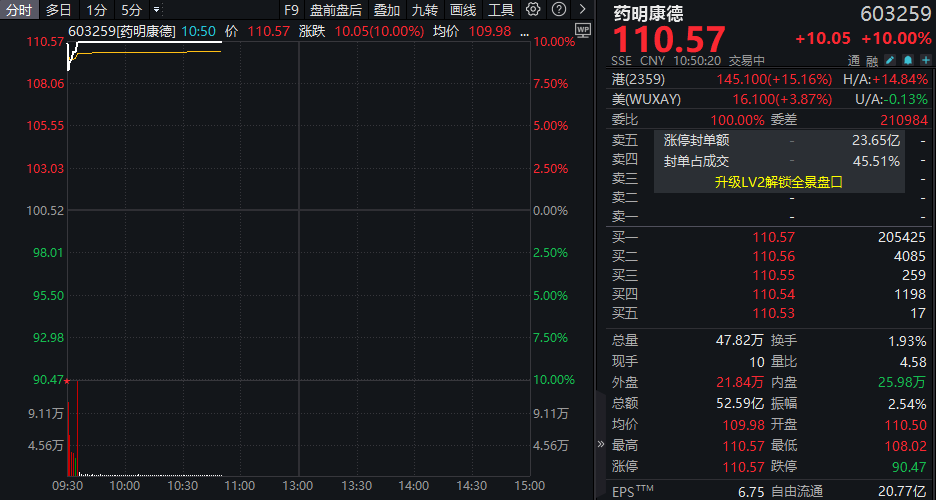 CXO龙头股药明康德今日开盘罕见涨停,仅用时约5分钟就封住涨停。截至发稿,该股成交金额超52亿元。