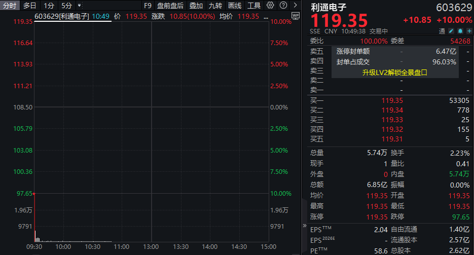 值得一提的是,同样在交出亮眼的业绩成绩单后,股价走出涨停的还有利通电子(603629)。早间开盘,该股“一字”涨停,股价创下历史新高。