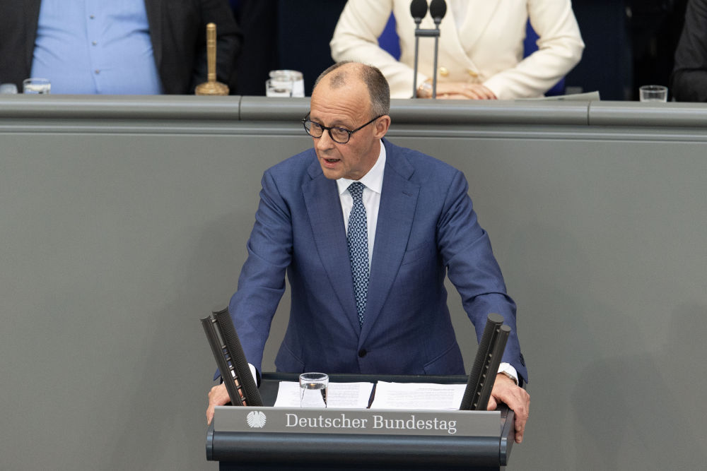 3月18日,德国总理默茨在位于首都柏林的德国联邦议院发表讲话。新华社记者 张豪夫 摄