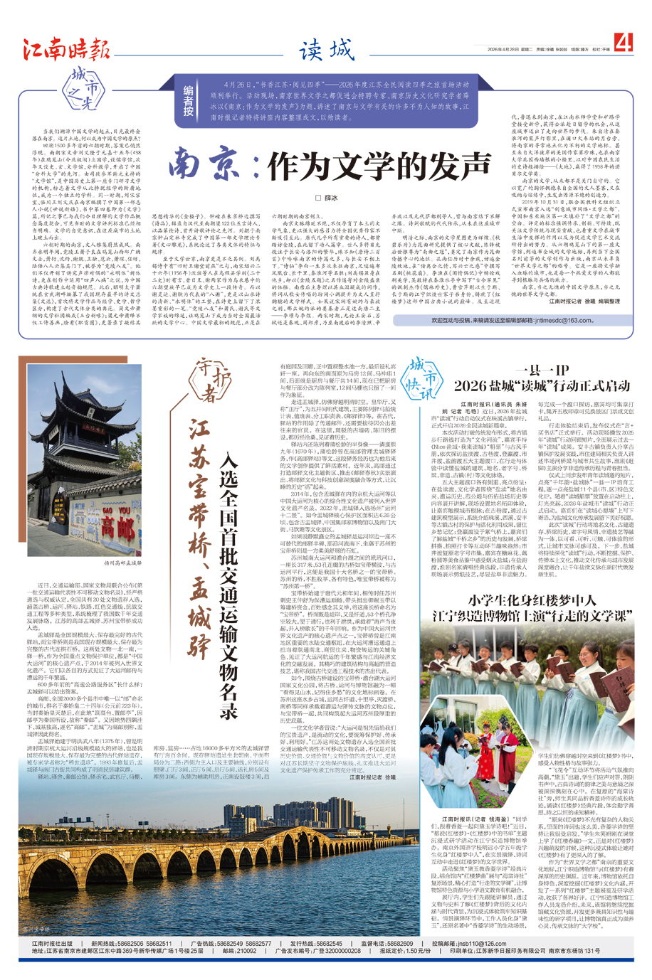4月26日,“书香江苏·阅见四季”——2026年度江苏全民阅读四季之旅首场活动顺利举行。活动现场,南京世界文学之都促进会特聘专家、南京历史文化研究学者薛冰以《南京:作为文学的发声》为题,讲述了南京与文学有关的许多不为人知的故事,江南时报记者特将讲座内容整理成文,以飨读者。