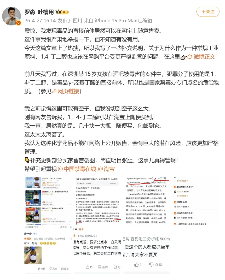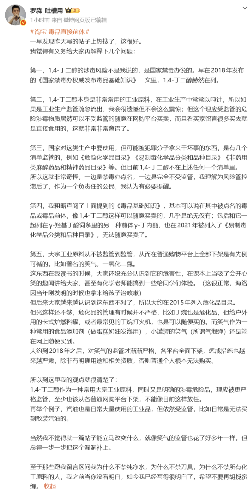 4月28日,罗淼再次发文,解释其观点:1,4-丁二醇作为一种常用大宗工业原料,同时又是明确的涉毒危险品,理应被更严格监管,至少也该从各普通网购平台下架,不能像目前这样放任。