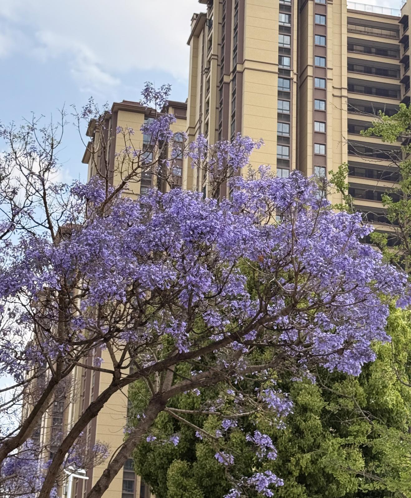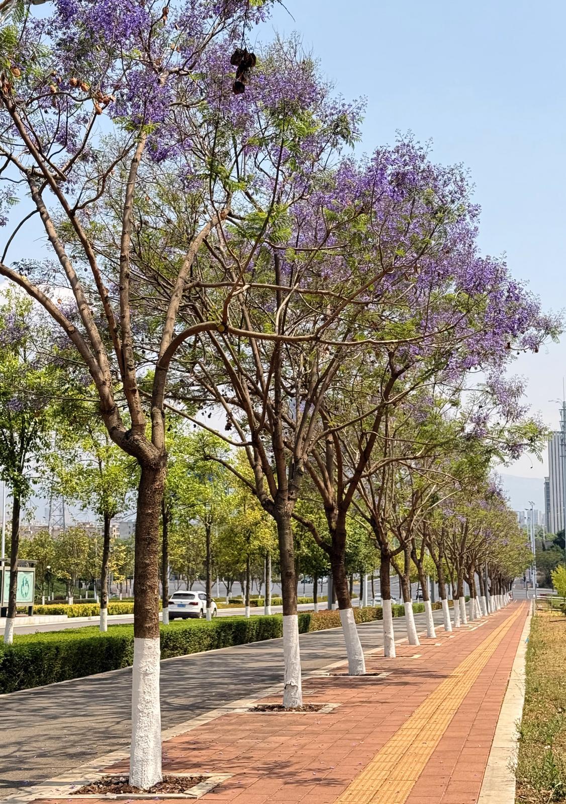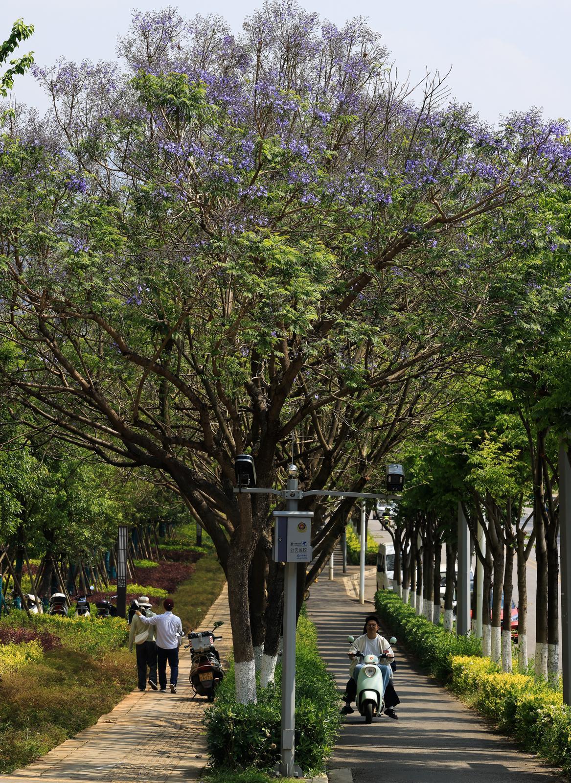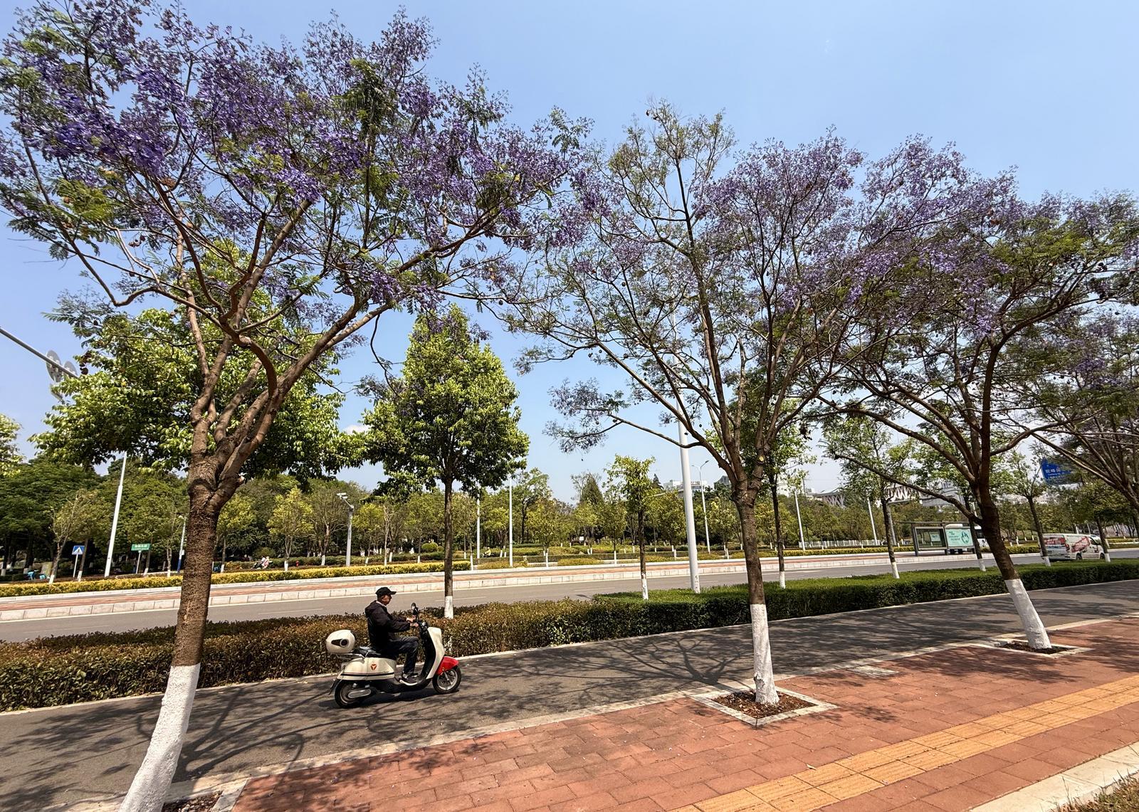 据了解,呈贡区蓝花楹盛花期较昆明主城区晚一至两周,可与主城区的蓝花楹完美错峰,预计5月初迎来最佳观赏期。盛放时节,成片蓝花楹缀满街头,淡雅柔美的紫蓝色花簇错落枝头,与城市楼宇相互映衬,勾勒出清新治愈的城市风光。