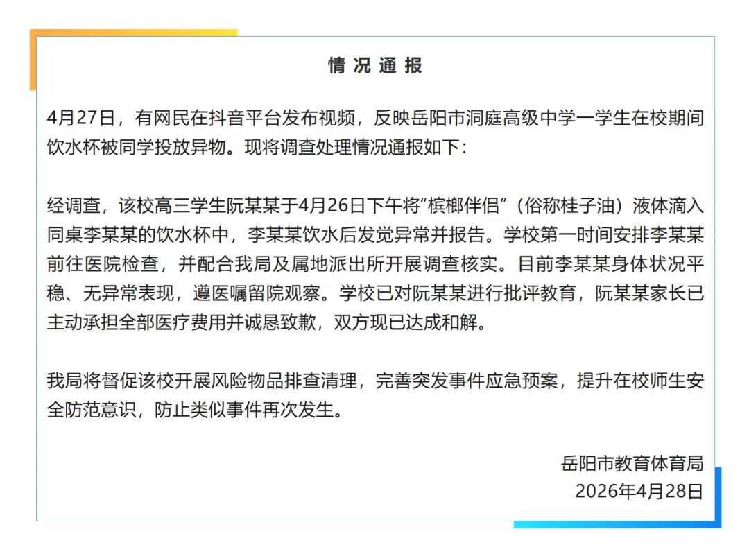 4月27日,有网民在抖音平台发布视频,反映岳阳市洞庭高级中学一学生在校期间饮水杯被同学投放异物。经调查,该校高三学生阮某某于4月26日下午将“槟榔伴侣”(俗称桂子油)液体滴入同桌李某某的饮水杯中,李某某饮水后发觉异常并报告。学校第一时间安排李某某前往医院检查,并配合我局及属地派出所开展调查核实。目前李某某身体状况平稳、无异常表现,遵医嘱留院观察。学校已对阮某某进行批评教育,阮某某家长已主动承担全部医疗费用并诚恳致歉,双方现已达成和解。