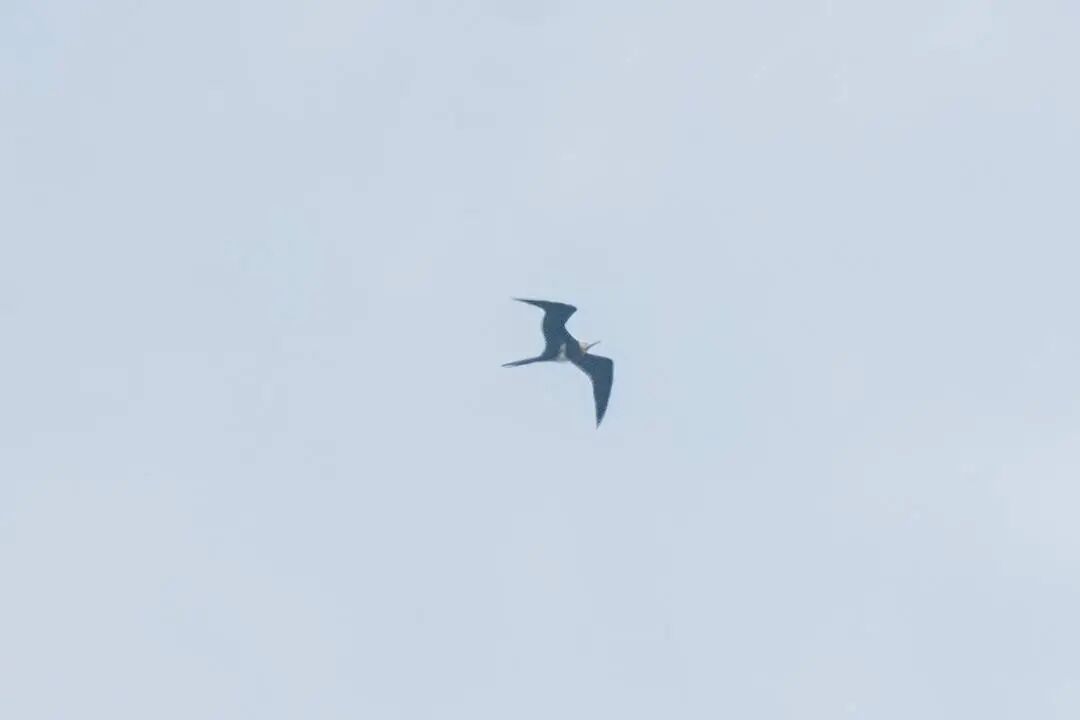 凭借多年的观鸟经验,桑梓立刻意识到这可能是一只极其罕见的鸟类。他一边迅速按动快门捕捉画面,一边通过对讲机呼叫在附近山头值守的其他监测队员。经鸟类专家和资深观鸟爱好者们鉴定,确认这是一只幼年雄性白斑军舰鸟。