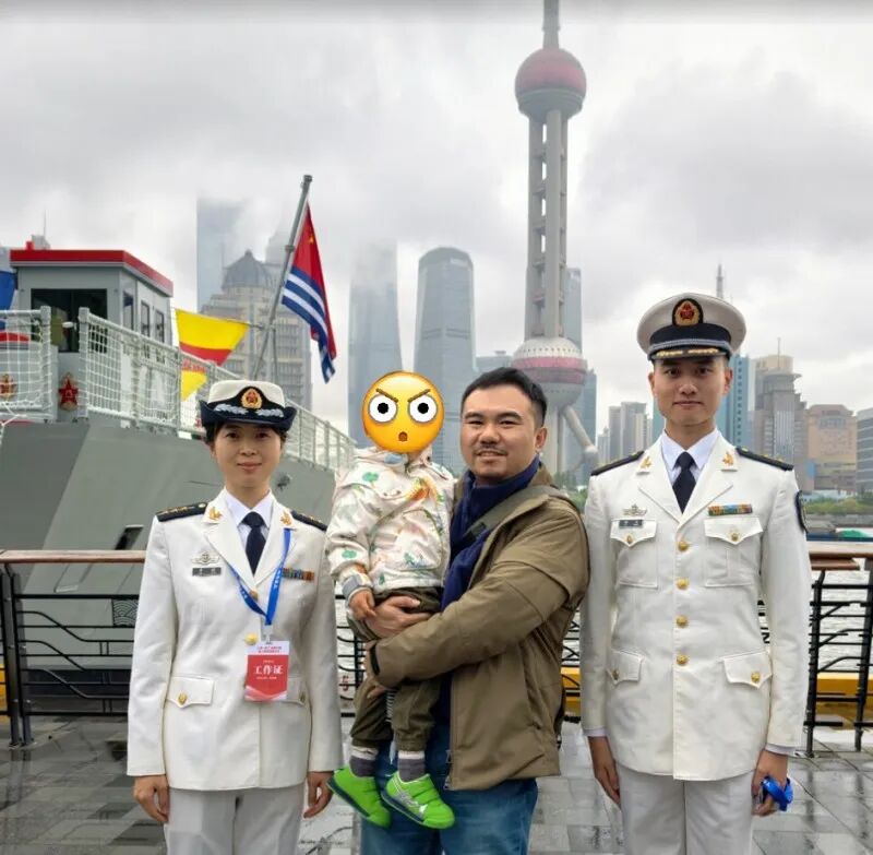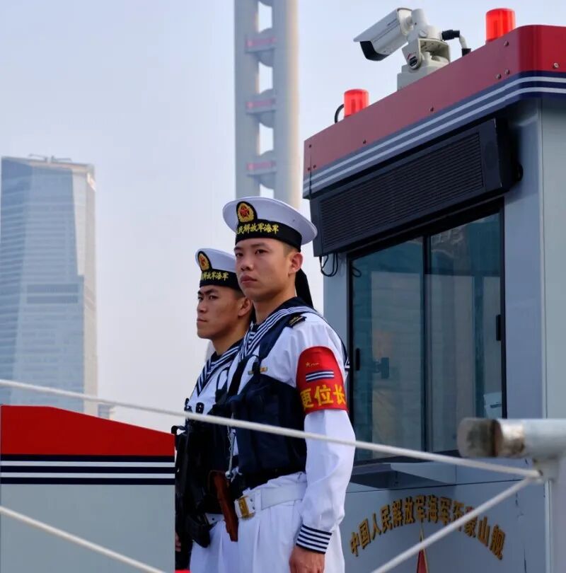 两位迎宾的海军军官站的位置也非常讲究,正好可以拍到阜阳舰与东方明珠这个地标