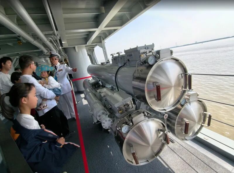 也因此,在054A以及052D上位于船舱内部禁止拍照的三联装324鱼雷发射器,在泰州舰上就属于可以随意拍的东西了。甚至因为参观路线经过巨大的四联装导弹发射架,还可以摸着导弹发射架拍摄合影,水兵甚至会指点一下站哪里、从哪个角度拍效果最好。