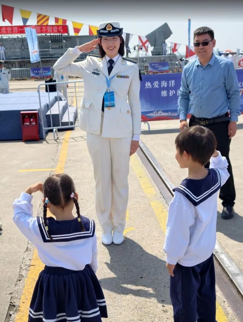 穿着水手服参观泰州舰的一对兄妹向女军官敬礼